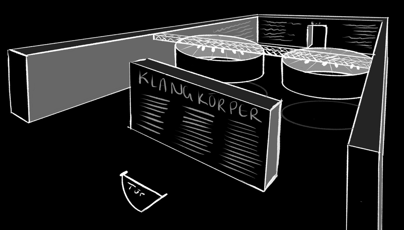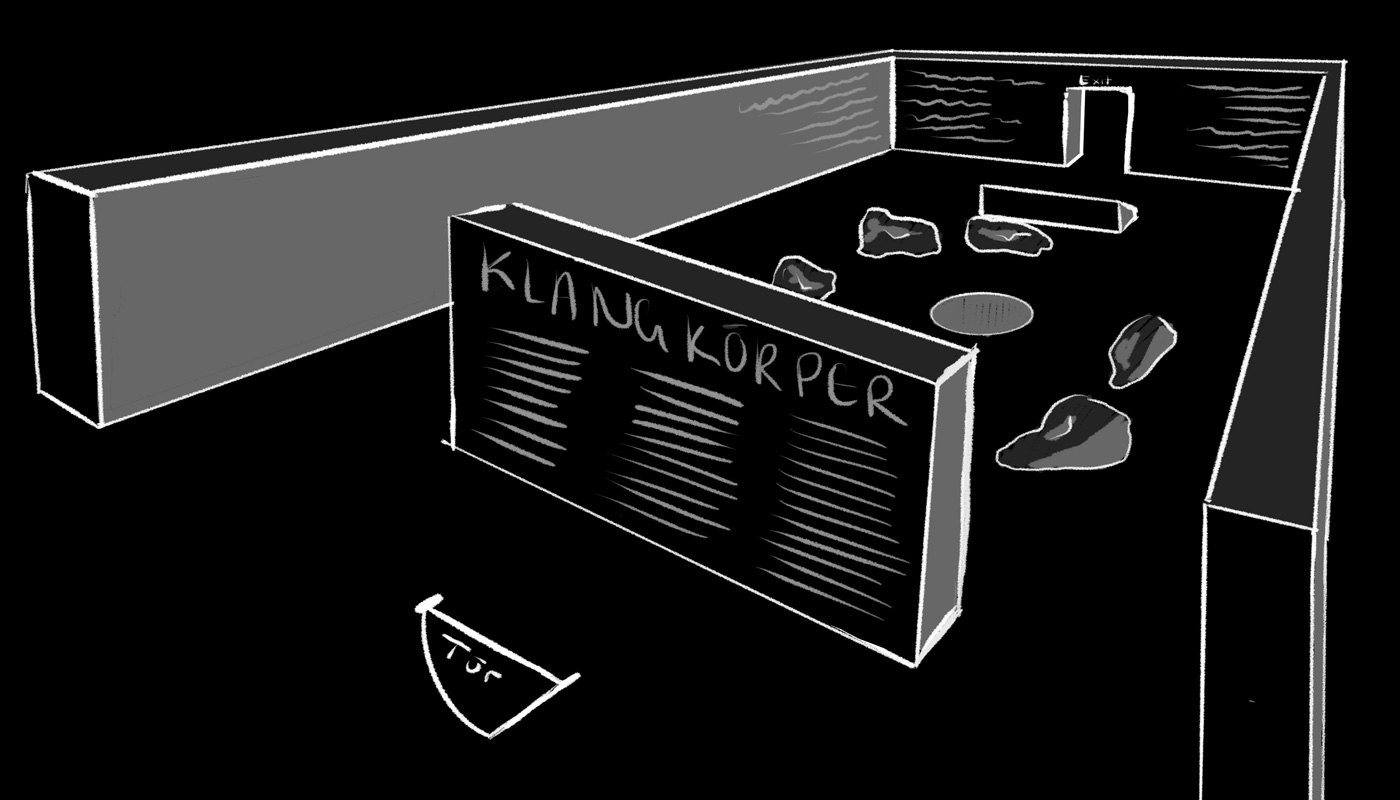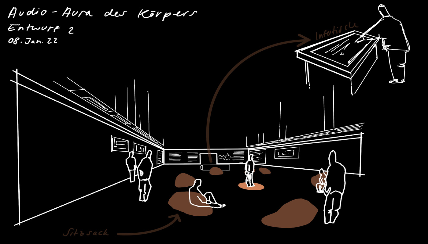 Wir einigten uns als Gruppe schnell auf die Ausgestaltung eines Ausstellungsraumes. Aus 5 ersten Ideen entwickelte sich nach erneuter gründlicher Recherche unser Raum Audio-Aura heraus. Um diesen abzurunden, gestalteten wir um diesen Raum herum das Konzept der Ausstellung Klangkörper. Im ersten Schritt bestimmten wir welche Messwerte wir der Konstruktion zu Grunde legen. Zur Auswahl stand zum einen die Körperfettwaage, die den Vorteil der einfachen Bedienung durch das Daraufstellen mitbrachte. Sowie die Messung der Gehirnwellen (EEG), für die wir uns letztendlich entschieden, die der Grundgedanke einer Aura durch die Grundlegende Funktion eines Gehirns als Speicher komplexer Informationen unterstreichen. Außerdem entsteht bei der Messung mit einem EEG nur ein Messwert, anders als bei der Waage (Fett, Knochen und Wasser), was uns die theoretische Verknüpfung mit Tönen und Farbe erleichterte. Anschließend ging es an die Visualisierung unserer Ideen durch Skizzen. Dabei entstanden unterschiedliche Konzepte zur Raumaufteilung, Aussehen und generellem Aufbau. Alle diese Skizzen bauen aufeinander auf und führten uns zu unserem letztendlichen Konzept und Ausgestaltung. Wir trafen uns regelmäßig als Team um grundlegende Fragen zu klären und verteilten die anfallenden Aufgaben untereinander gut auf