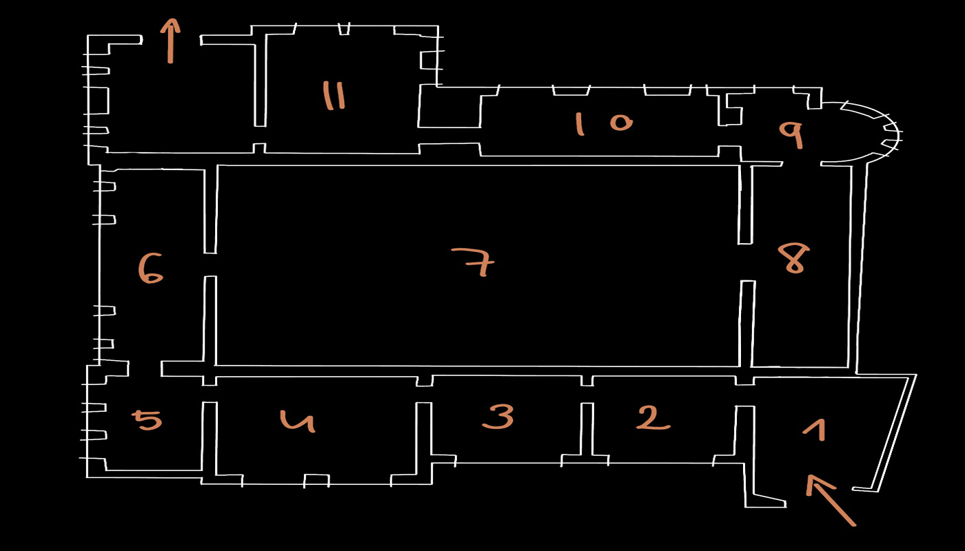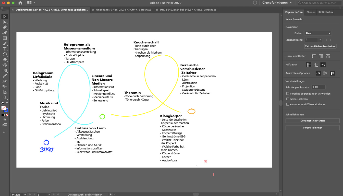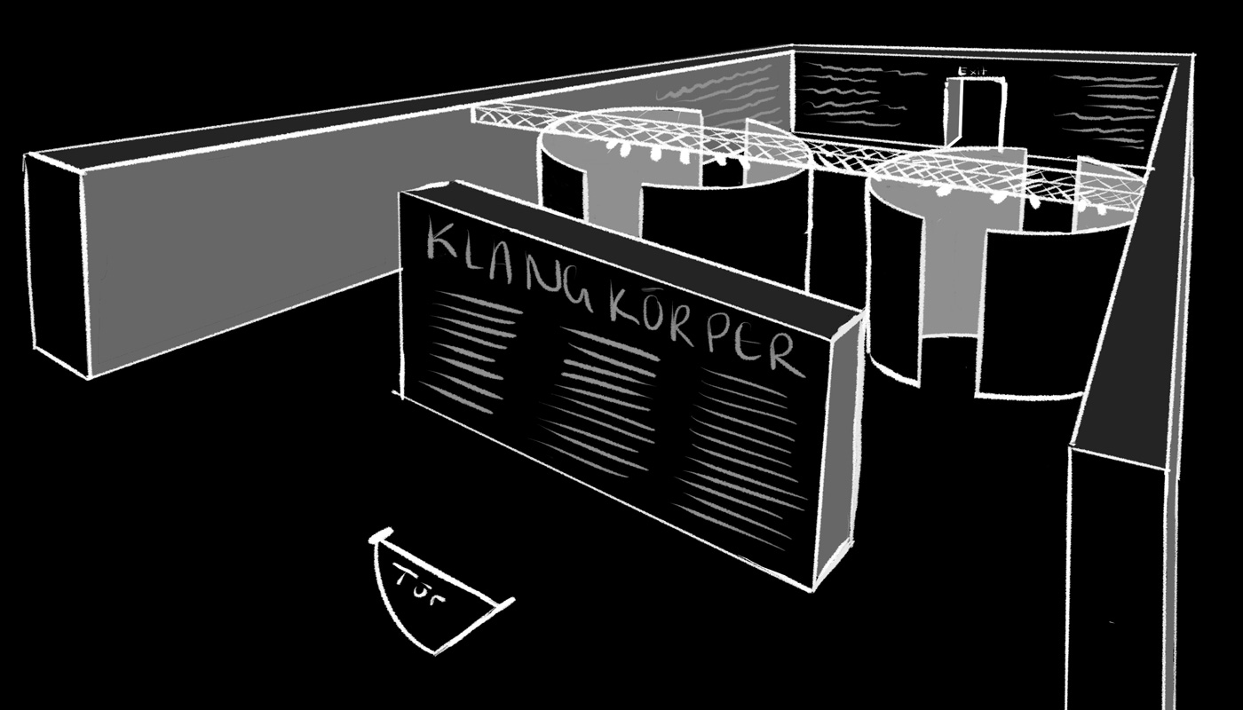 Wir einigten uns als Gruppe schnell auf die Ausgestaltung eines Ausstellungsraumes. Aus 5 ersten Ideen entwickelte sich nach erneuter gründlicher Recherche unser Raum Audio-Aura heraus. Um diesen abzurunden, gestalteten wir um diesen Raum herum das Konzept der Ausstellung Klangkörper. Im ersten Schritt bestimmten wir welche Messwerte wir der Konstruktion zu Grunde legen. Zur Auswahl stand zum einen die Körperfettwaage, die den Vorteil der einfachen Bedienung durch das Daraufstellen mitbrachte. Sowie die Messung der Gehirnwellen (EEG), für die wir uns letztendlich entschieden, die der Grundgedanke einer Aura durch die Grundlegende Funktion eines Gehirns als Speicher komplexer Informationen unterstreichen. Außerdem entsteht bei der Messung mit einem EEG nur ein Messwert, anders als bei der Waage (Fett, Knochen und Wasser), was uns die theoretische Verknüpfung mit Tönen und Farbe erleichterte. Anschließend ging es an die Visualisierung unserer Ideen durch Skizzen. Dabei entstanden unterschiedliche Konzepte zur Raumaufteilung, Aussehen und generellem Aufbau. Alle diese Skizzen bauen aufeinander auf und führten uns zu unserem letztendlichen Konzept und Ausgestaltung. Wir trafen uns regelmäßig als Team um grundlegende Fragen zu klären und verteilten die anfallenden Aufgaben untereinander gut auf