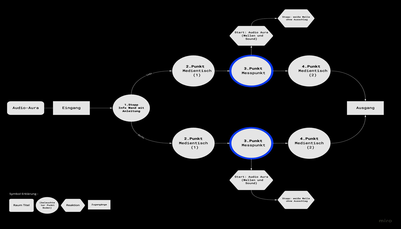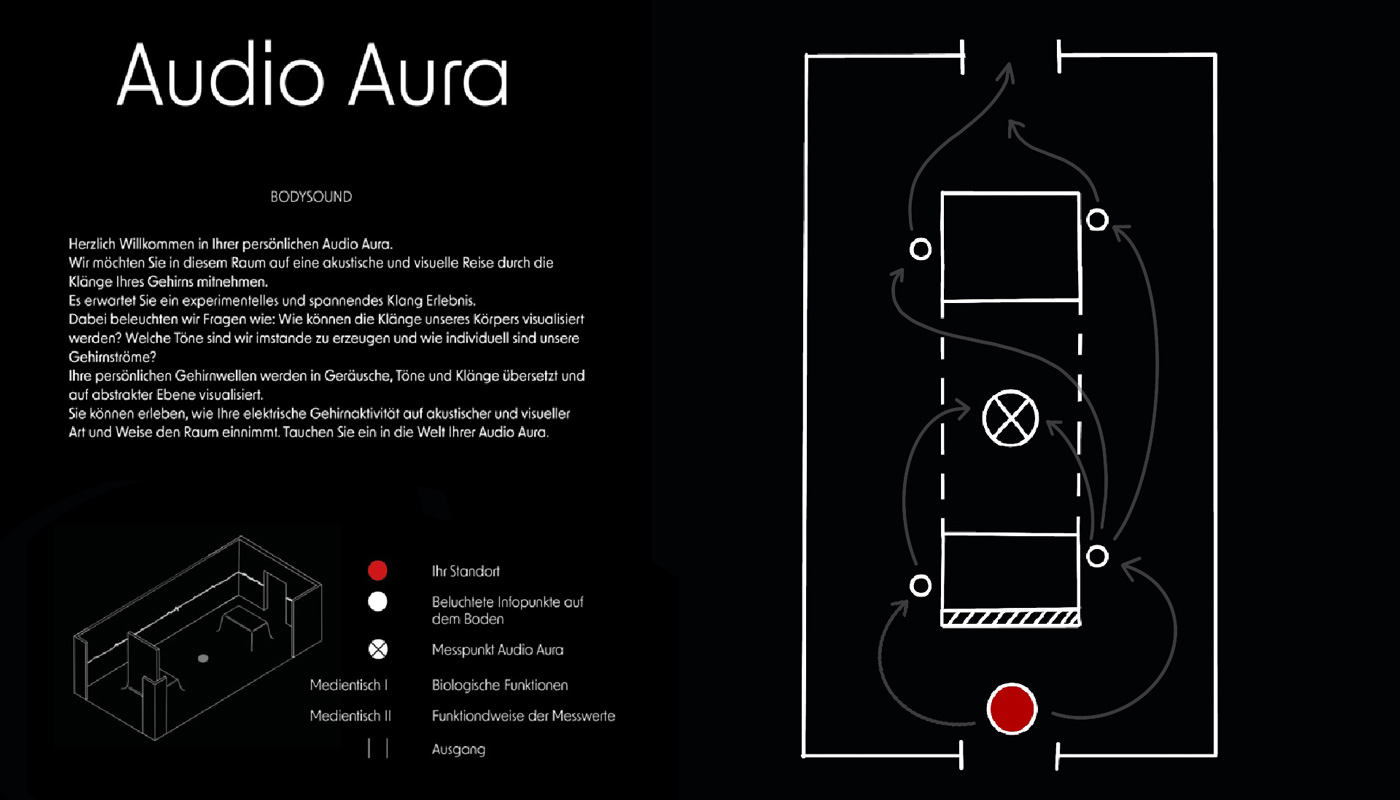 Sonification heißt Datenverklanglichung. Wir verwandeln in unserem Ausstellungsraum Daten, also eine Masse von Zahlen, in Klänge. Die Daten erheben wir mithilfe eines EEG Stirnbands. Die durch das EEG Gerät gewonnenen Daten werden in ein Computersystem eingespeist und dort so gewandelt, das Töne erzeugt werden, die dann in einem Zusammenspiel die Audio Aura bilden. Die Daten werden mit dem Muse: Brain-Sensing Headband erhoben und mit der Mind Monitor App ausgewertet. Die App zeigt in Echtzeit die Daten, die von der App nach Ableton live, ein Sequenzer/ Werkzeug zur Musikproduktion, gesendet werden, wo aus den Daten dann der individuelle Audio Aura Klangteppich erzeugt wird. Die Farbe für die Audio Aura wird auf Grundlage der Töne erzeugt. Dem Farbkreis werden in einem Computerprogramm die verschiedenen Töne zugeordnet und mit Beamern an die Wand und den Boden projiziert.