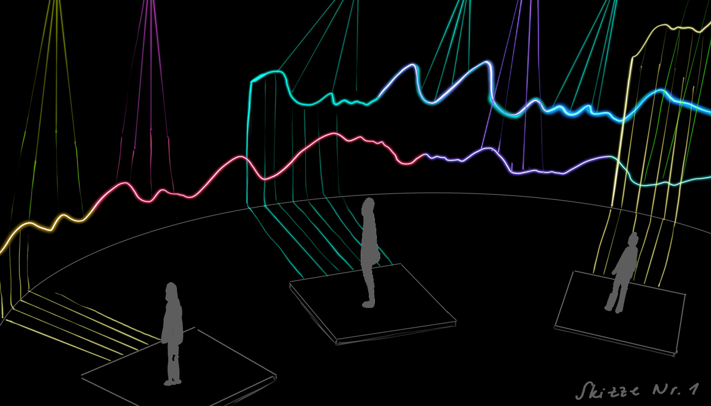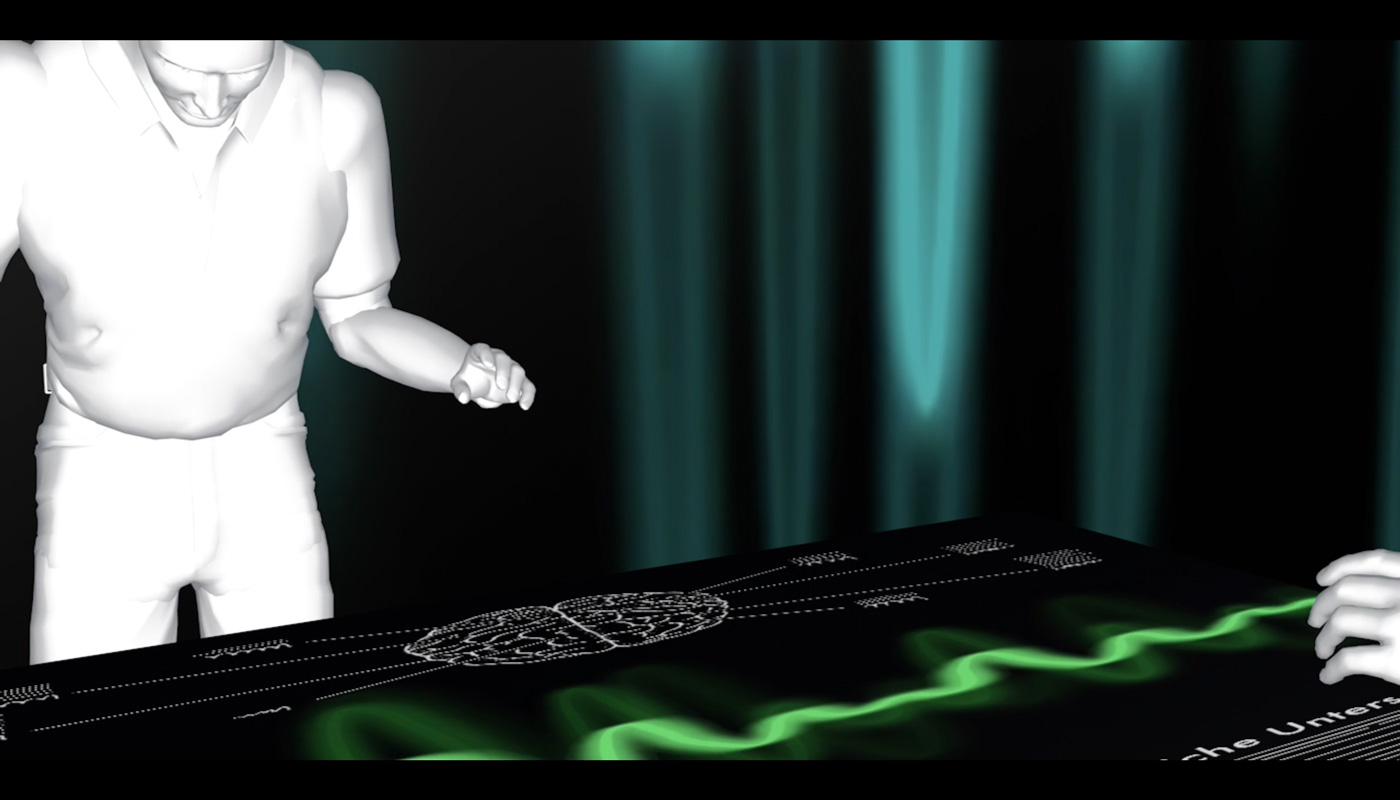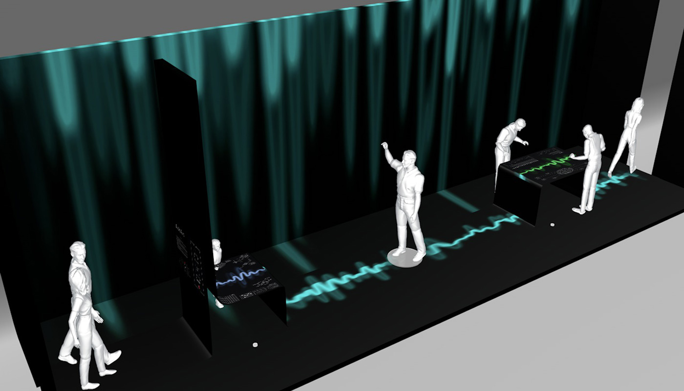 Nach unserer intensiven Recherche gestalteten und animierten wir die Wellengrafiken, legten Raummaße fest, korrigierten kleine Details wie zum Beispiel die Ausrichtung der Projektoren, um Schatten zu vermeiden und gestalteten ein Layout für Infotafeln und Medientische. Wir entschieden uns für das bewusste Ineinanderfließen von Medientischen und Messpunkt in der Mitte um Interaktion zu generieren und alle Besucher im Raum mit einzubinden. Die Medientische ahmen im Seitenschnitt eine abstrakte Welle nach und beziehen sich somit auf das Raumthema der Gehirnwellen.
