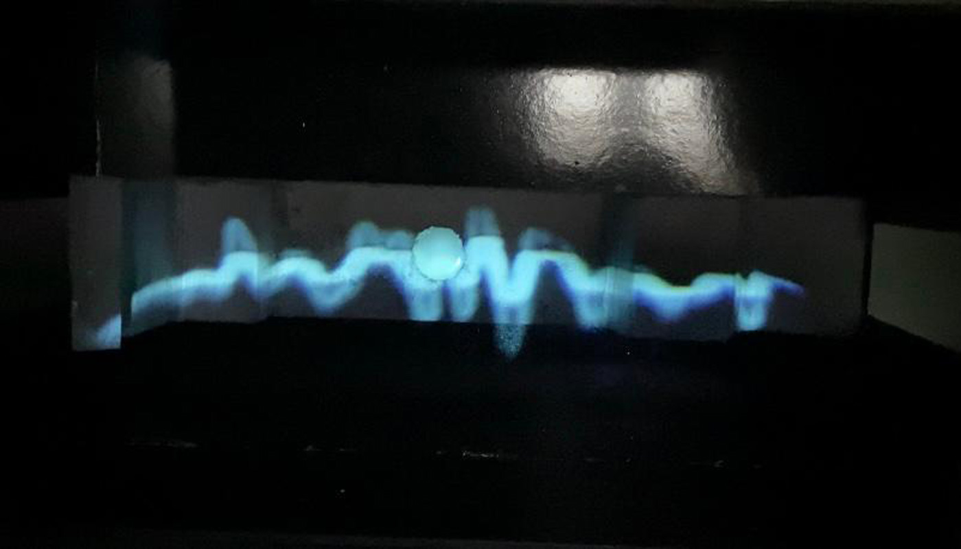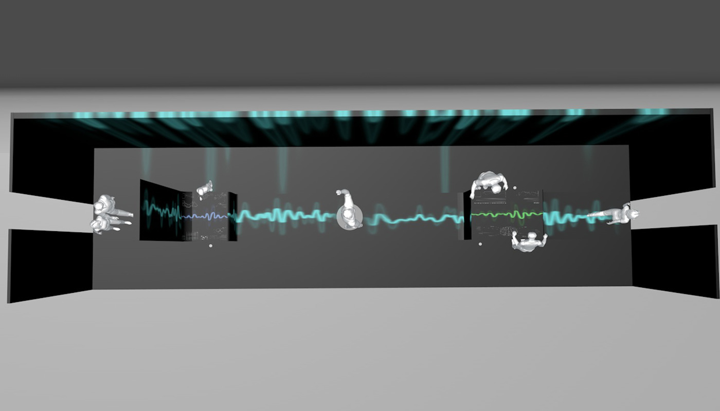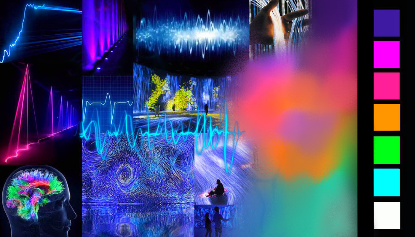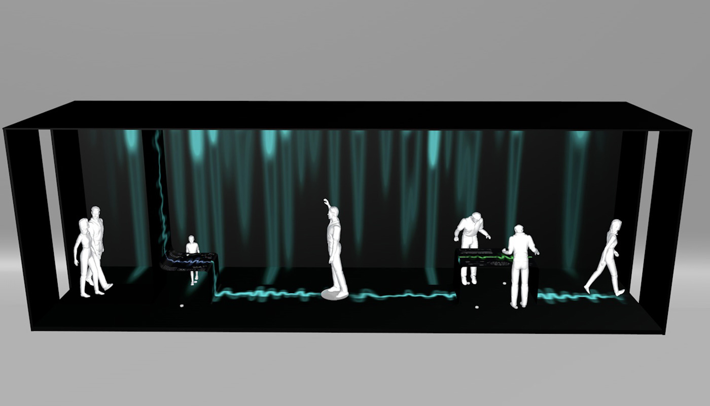 Nach unserer intensiven Recherche gestalteten und animierten wir die Wellengrafiken, legten Raummaße fest, korrigierten kleine Details wie zum Beispiel die Ausrichtung der Projektoren, um Schatten zu vermeiden und gestalteten ein Layout für Infotafeln und Medientische. Wir entschieden uns für das bewusste Ineinanderfließen von Medientischen und Messpunkt in der Mitte um Interaktion zu generieren und alle Besucher im Raum mit einzubinden. Die Medientische ahmen im Seitenschnitt eine abstrakte Welle nach und beziehen sich somit auf das Raumthema der Gehirnwellen.