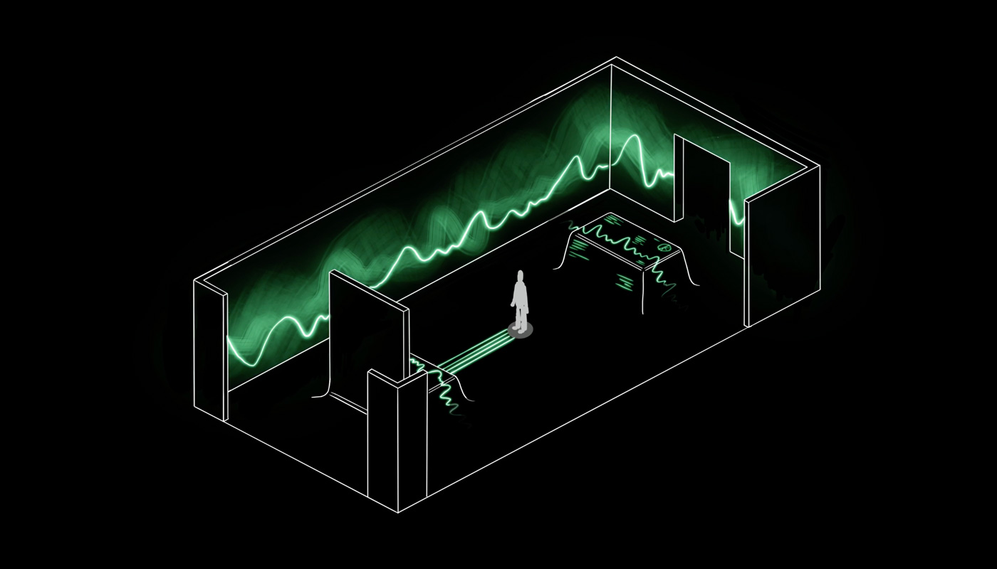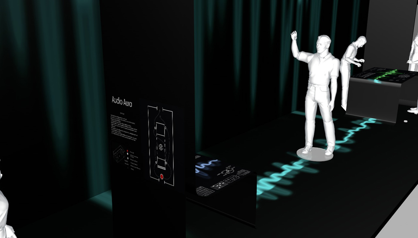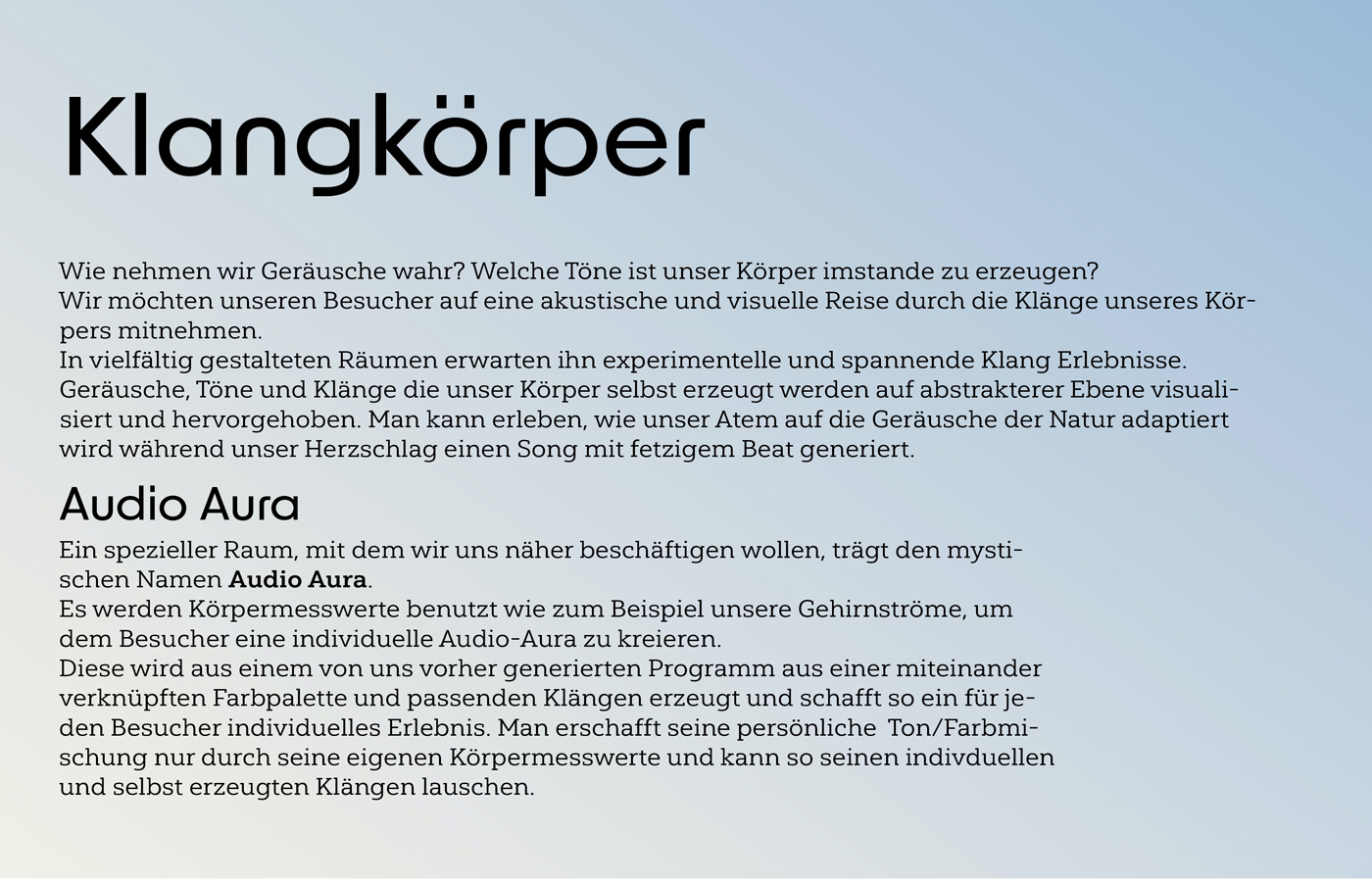 Unter dem Namen Klangkörper gestaltetet wir eine Ausstellung, die den Besucher akustisch und visuell auf die Reise durch die Klänge unseres Körpers mitnimmt. Wir konzentrierten uns dabei auf den Raum Audio Aura, wo der Besucher dazu angeregt wird durch das Messen seiner Gehirnwellen seine Individuelle und persönliche Audio-Aura zu kreieren. Diese wird durch ein Programm aus einer miteinander verknüpften Farbpalette und passenden Klängen erzeugt und schafft so für jeden Besucher ein individuelles Raum Erlebnis.