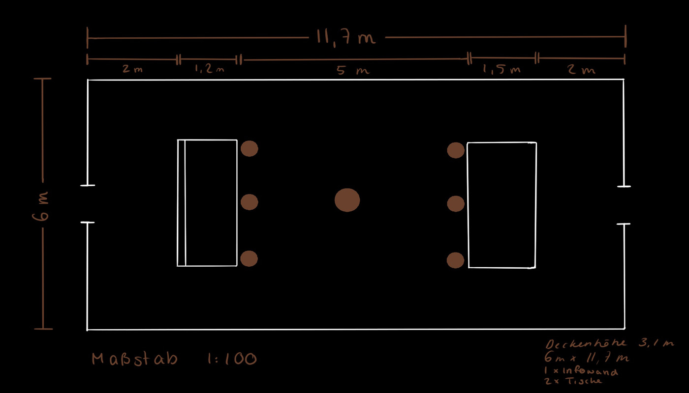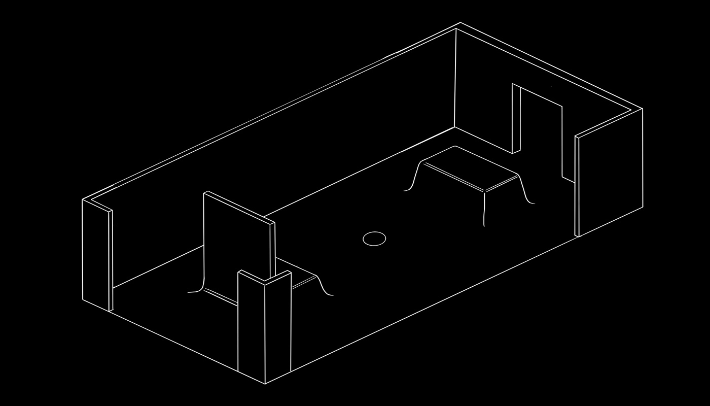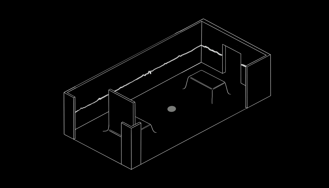 Für die Prototypen war es uns wichtig möglichst vielfältige Medien anzuwenden, um die Ausgestaltung komplett zu durchdringen. Zum einen zeichneten wir den ausgestalteten Raum mehrmals, um ein Gefühl für Maße und Farbe zu bekommen. Nach dem auch die genauen Maße für Tische und Raum festgelegt waren gestalteten wir diesen in 3D mit dem Programm Cinema 4D und bauten ihn als physisches Modell nach. Außerdem testeten wir unsere Wellengrafik mit einem Projektor auf einem mit weißem Bettlaken behangenen Tisch im Zimmer, um das räumliche Erlebnis nachzuempfinden.