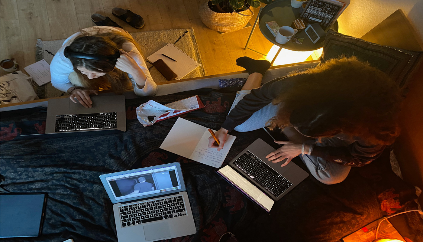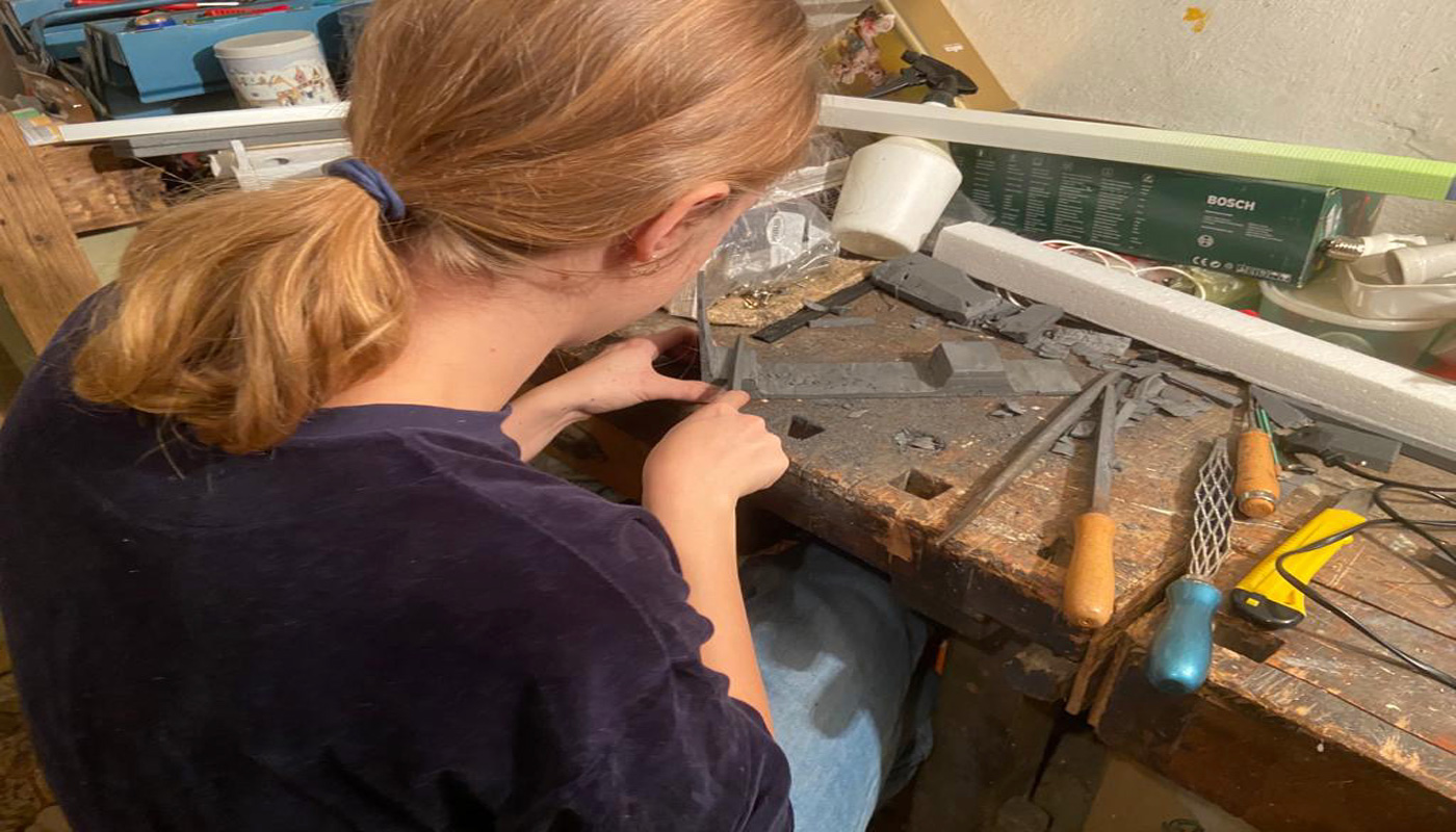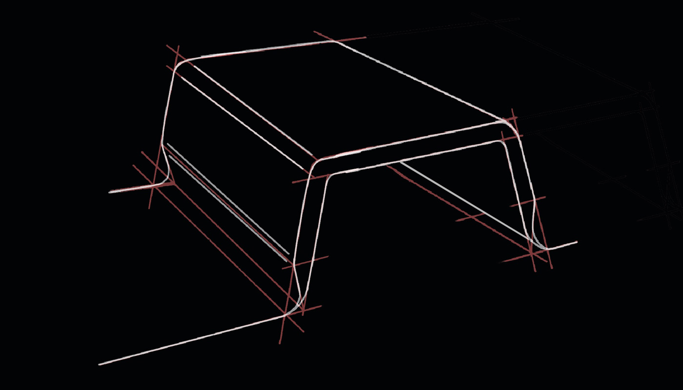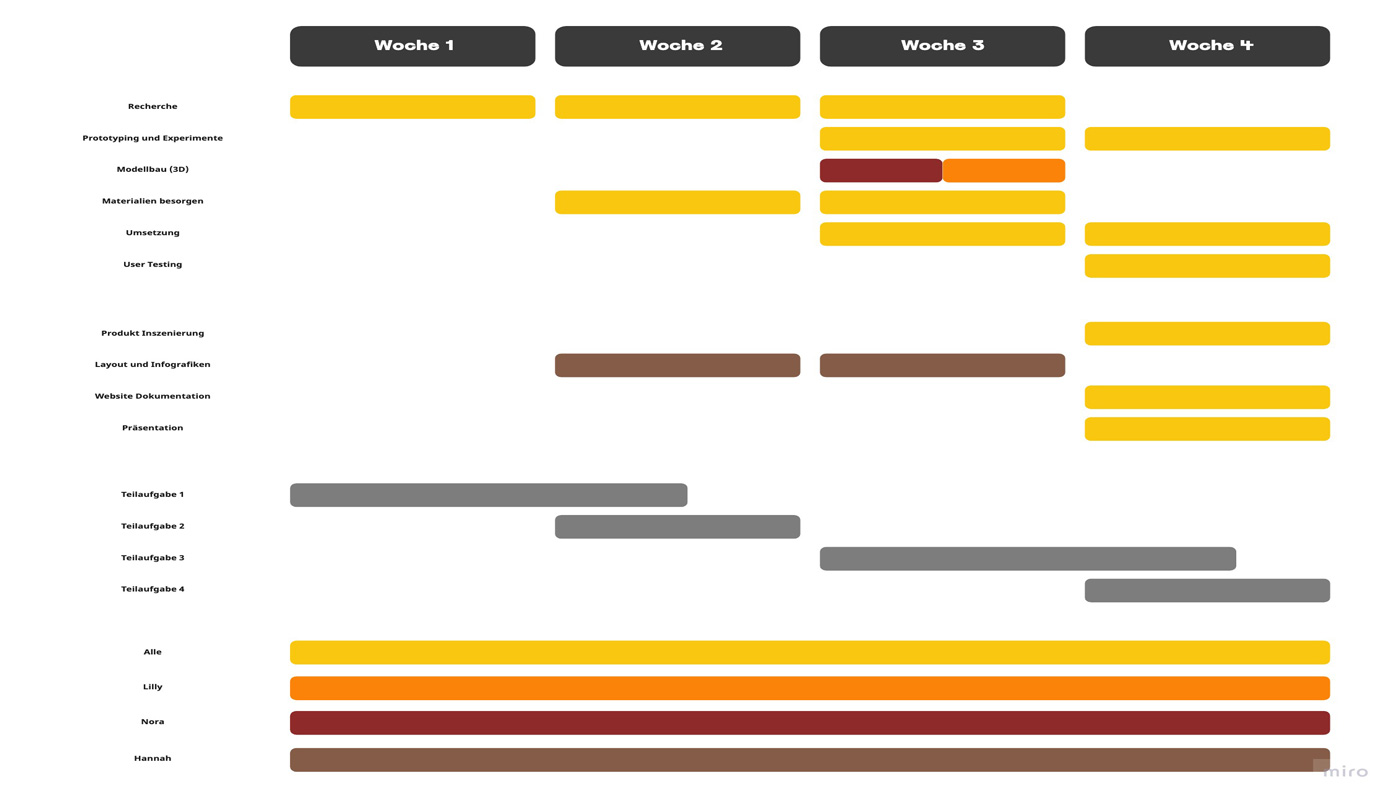 Für die Prototypen war es uns wichtig möglichst vielfältige Medien anzuwenden, um die Ausgestaltung komplett zu durchdringen. Zum einen zeichneten wir den ausgestalteten Raum mehrmals, um ein Gefühl für Maße und Farbe zu bekommen. Nach dem auch die genauen Maße für Tische und Raum festgelegt waren gestalteten wir diesen in 3D mit dem Programm Cinema 4D und bauten ihn als physisches Modell nach. Außerdem testeten wir unsere Wellengrafik mit einem Projektor auf einem mit weißem Bettlaken behangenen Tisch im Zimmer, um das räumliche Erlebnis nachzuempfinden.