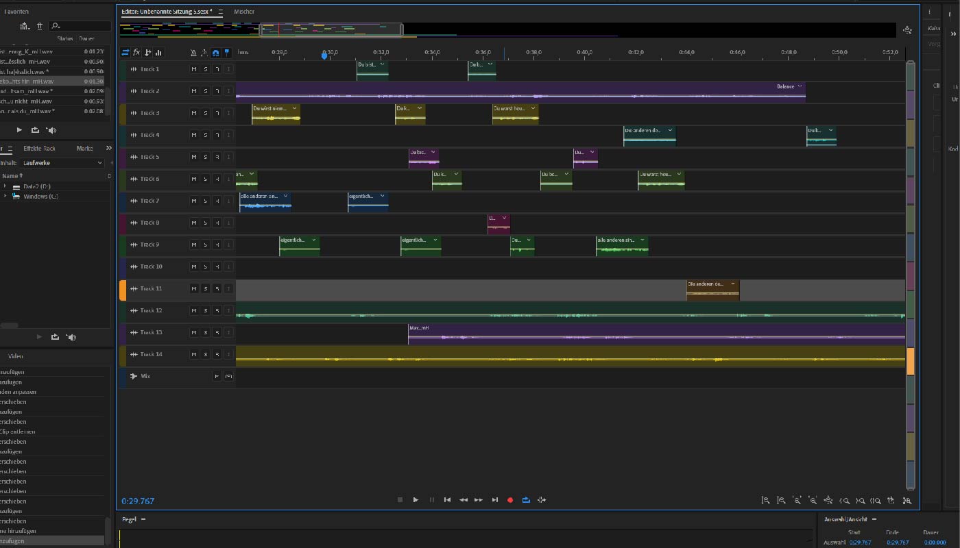 Für die Audiodatei wurden zunächst 30 mögliche Sorgen, Ängste und Gedanken aufgeschrieben und diese anschließend aufgenommen. Die Aufnahmen wurden dann mit Adobe Audition bearbeitet. Eventuelles Hintergrundrauschen ist nun entfernt und einige Effekte, wie Verzerrungen und Hall sind hinzugefügt worden. Anschließend wurden die Aufnahmen versetzt übereinander gelegt und als Hintergrundgeräusche ein Herzklopfen und Tinnitus von YouTube hinzugefügt.