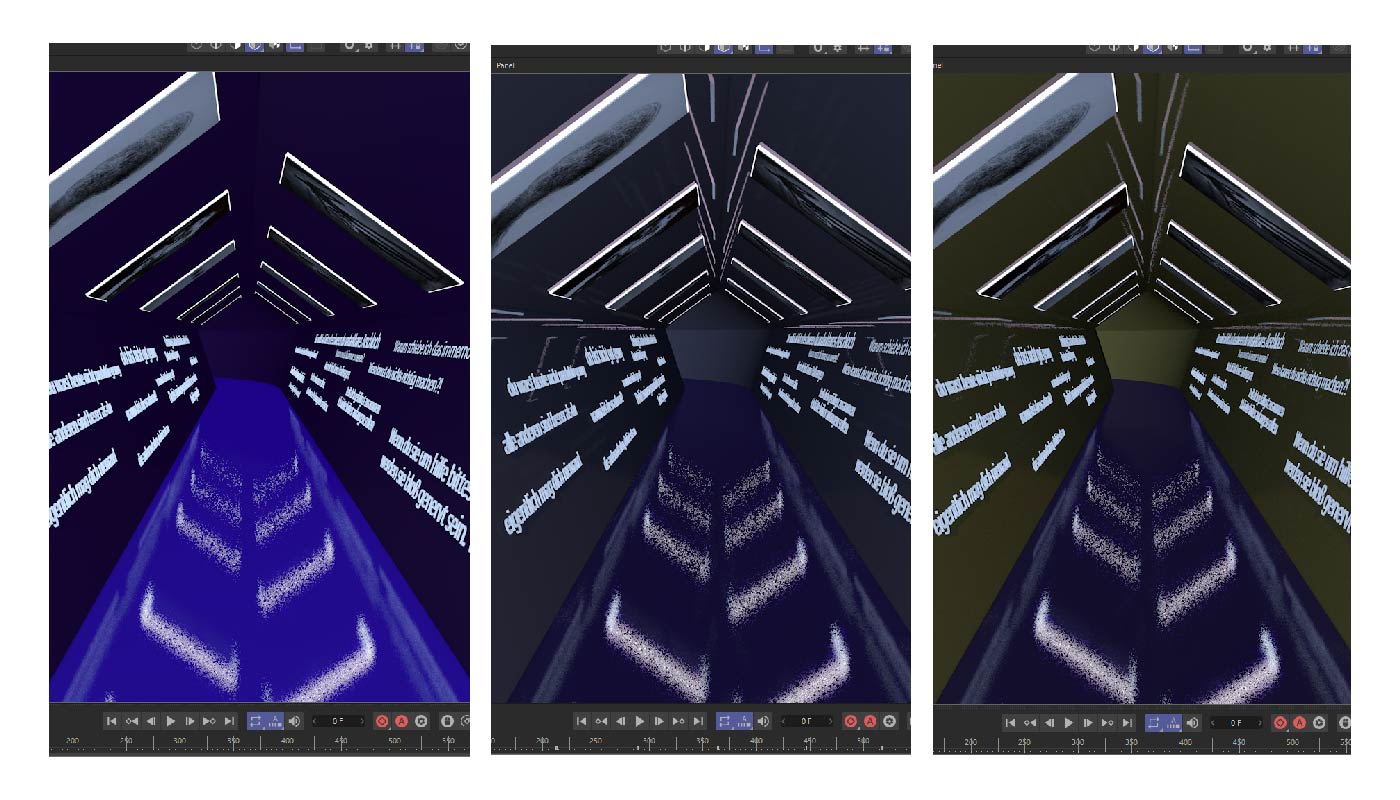 Nachdem die Kamerafahrt erstellt war, wurden noch unterschiedliche Farben und Materialien ausprobiert. Schließlich sollte das Labyrinth in ein mattes Lila mit einer brüchigen Textur, die die bedrückende Atmosphäre unterstützt, ausgestattet sein. Der Farbton half dabei die Wände einerseits dunkel und bedrückend aber gleichzeitig räumlich zu gestalten. Zudem vermittelt die Farbe Lila auch etwas Mysteriöses und Ungewisses, was die Thematik der Ausstellung unterstreicht. Das Video besteht letztendlich aus neunhundert Frames. Mit dem fertigen Video sind wir sehr zufrieden, jedoch muss man bedenken, dass dies lediglich ein Prototyp darstellt. Gestalterische Veränderungen und weitere Entwicklung in der richtigen Ausstellung wären nach wie vor möglich. So wurde im letzten Schritt auch noch ausprobiert, wie der Tunnel mit wesentlich mehr Schriftzügen wirken würde. Die Idee dahinter bestand darin, dass die visuellen Massen an Gedanken auf diese Weise noch einschüchternder und chaotischer und immenser wirken sollten.