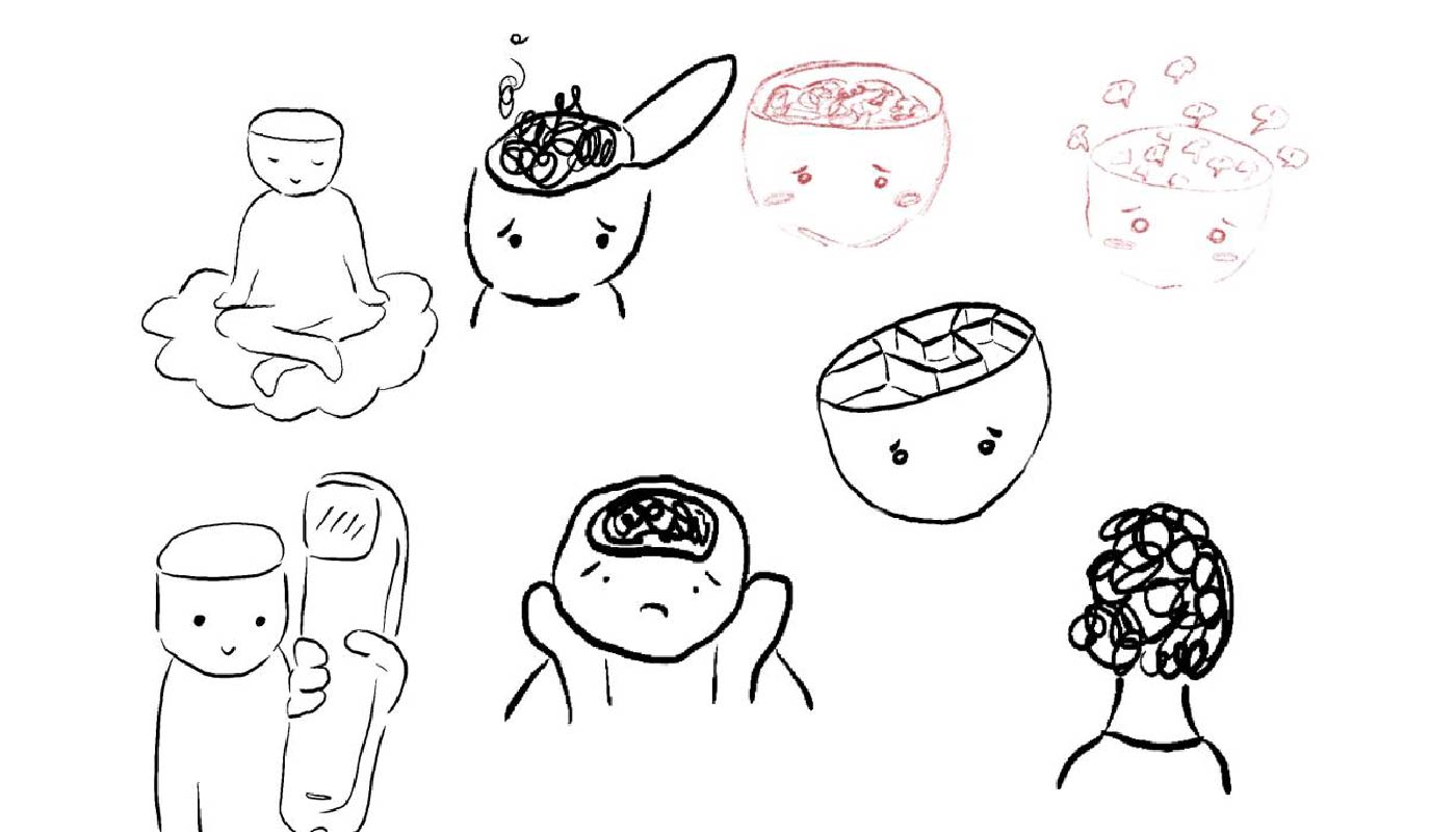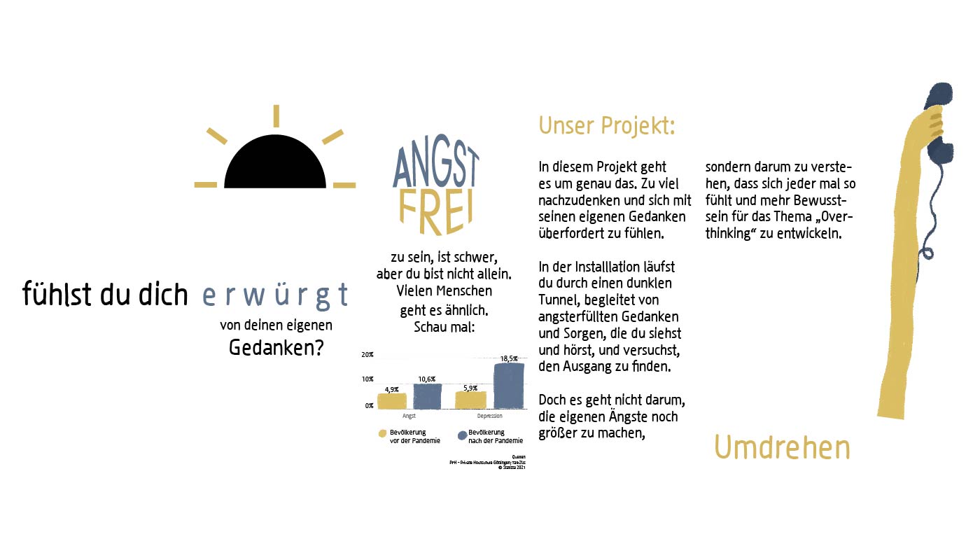 Durch die Corona Pandemie wurde man dazu gezwungen sehr viel Zeit alleine zu verbringen. Grundsätzlich ist das nichts Schlimmes und kann manchmal sicher auch ziemlich gut tun. Sollte man allerdings in eine Spirale des „Overthinkings“, gelangen, kann diese Zeit alles andere als entspannend werden. Die Ausstellung illustriert dieses Problem in Form eines Tunnels, welcher derdie BesucherIn begehen kann. Dort erwarten SieIhn angebrachte Lautsprecher und andere Audioobjekte aus denen sowohl Geräusche, als auch immer wiederkehrende Gedanken, in Form von verschiedenen Sprechern, abgespielt werden. Unterstützt durch Illustrationen führt es die*den BesucherIn in eine vielleicht sogar, leicht verstörende Geräuschkulisse.