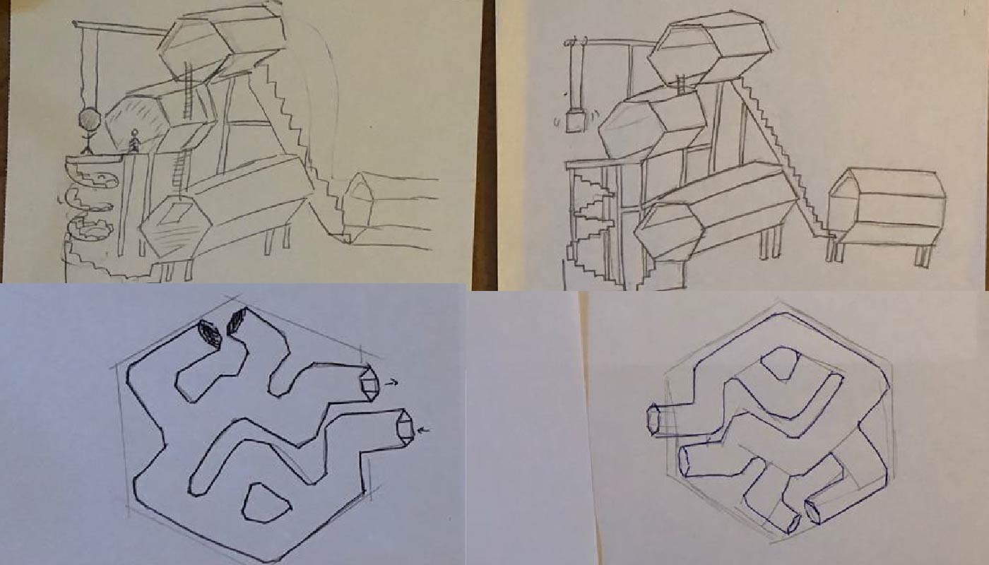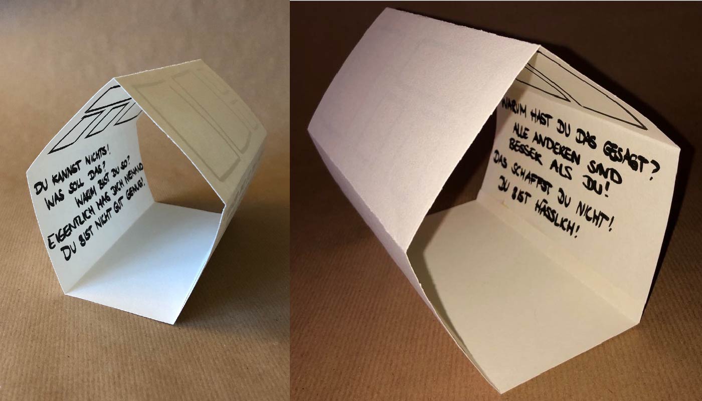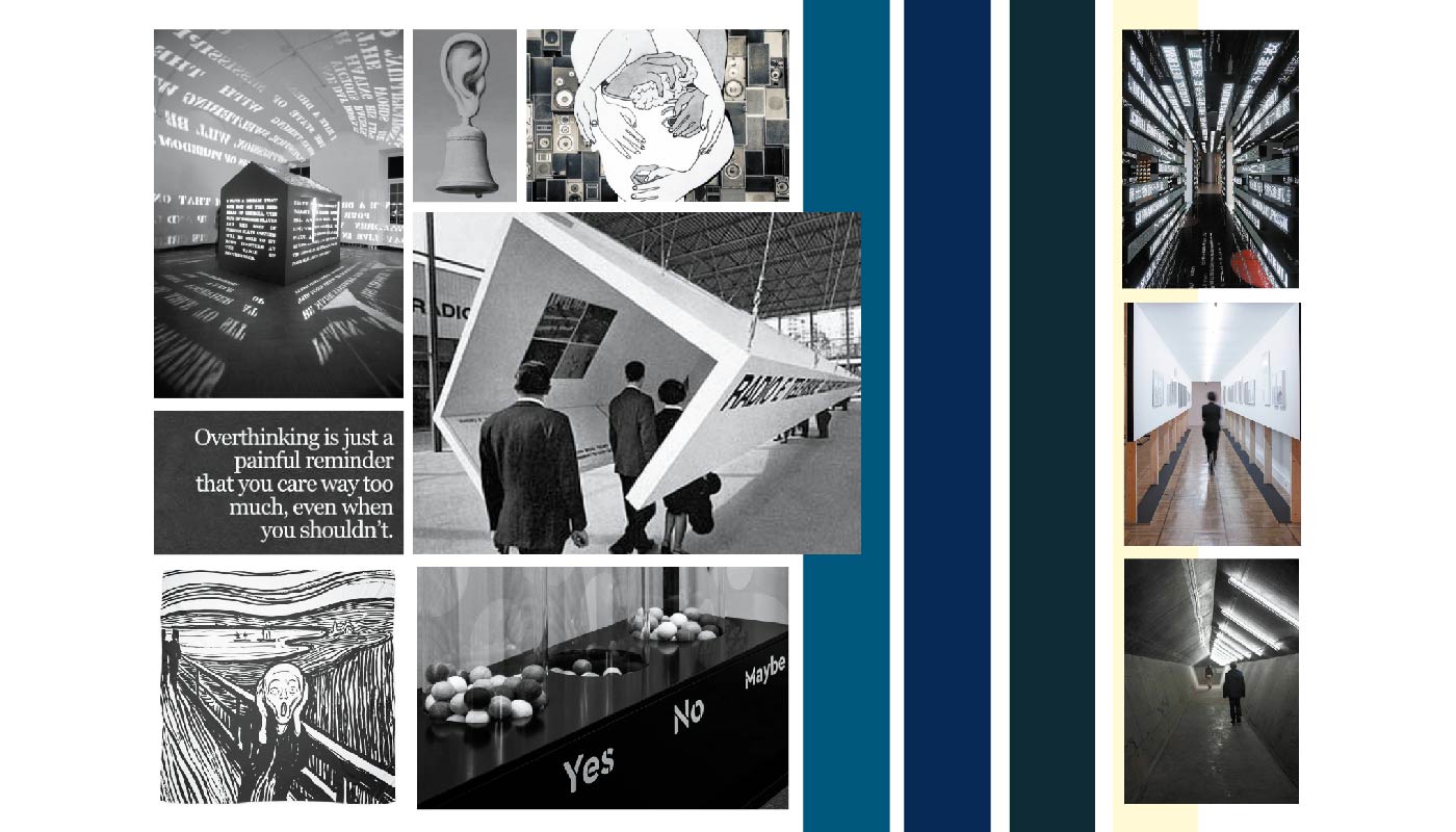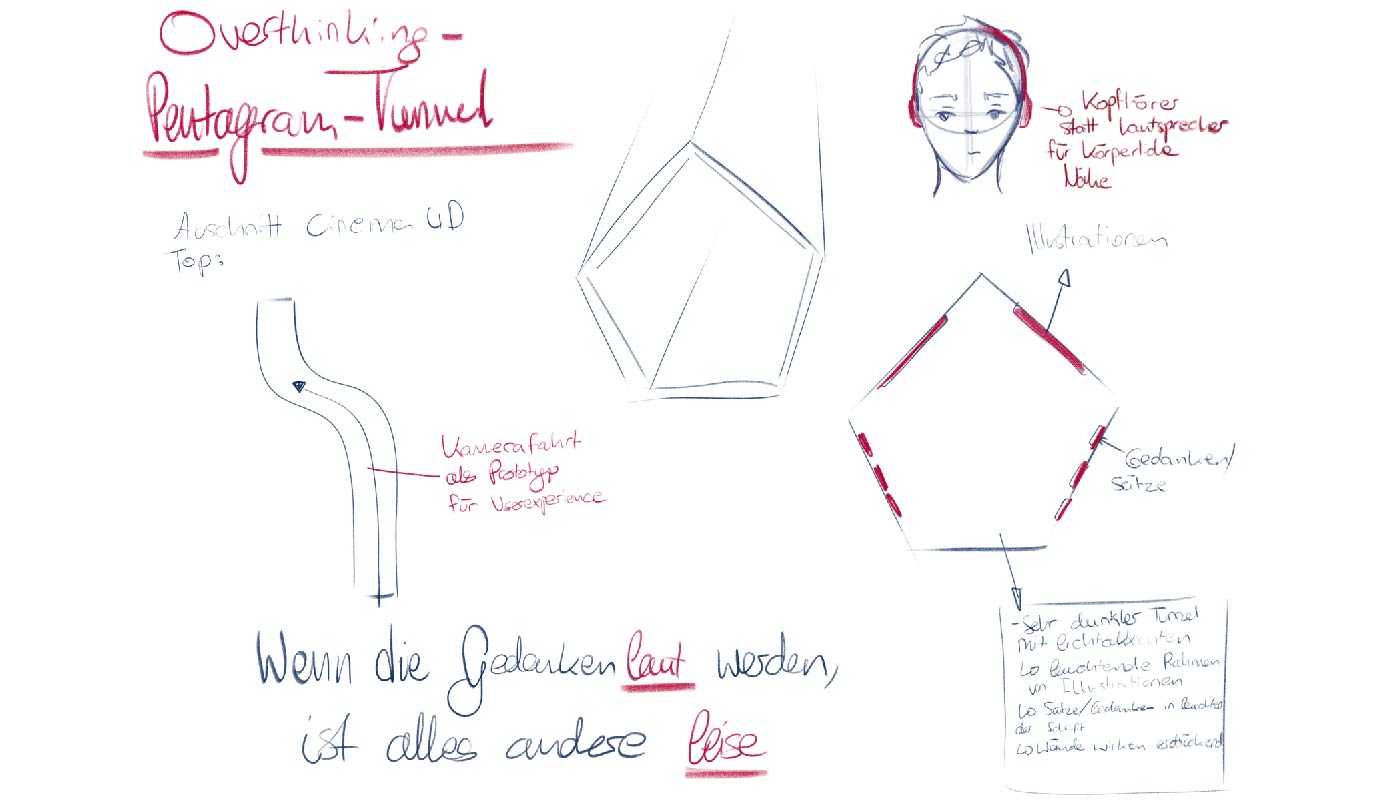 Für eine bessere Vorstellung des Aufbaus der Ausstellung, wurden zunächst verschiedene Varianten skizziert. Einmal eine Art Gerüst, bei welchem man auf- und absteigen kann. Die andere Variante war ein Tunnel. Der Tunnel machte dabei mehr Sinn, da man so passend zum Thema Overthinking, isoliert wird und ein beklemmenderes Gefühl bekommt. Zudem ist es bei dem Tunnel besser umzusetzen, die „lautleise“, Audioelemente zu vermitteln, wenn man sich in einem geschlossenem Gang befindet. Das Papiermodell wurde dann erstellt, um einen besseren Überblick des Aufbaus zu bekommen. Es zeigt die Anlehnung an ein Labyrinth, denn auch bei der Ausstellung soll es unübersichtlich wirken, zudem Verzweigungen und Sackgassen geben. Einen Abschnitt des Tunnels wurde dann in einem weiteren rapid Papierprototyp dargestellt, bei welchem die Sätze und Illustrationen an den Wänden des Pentagon eingezeichnet sind. Um ein Gefühl für die Größenverhältnisse der Schrift im Tunnel zu bekommen, wurde das Ganze getestet, indem ein Satz gedruckt und an der Wand befestigt wurde.