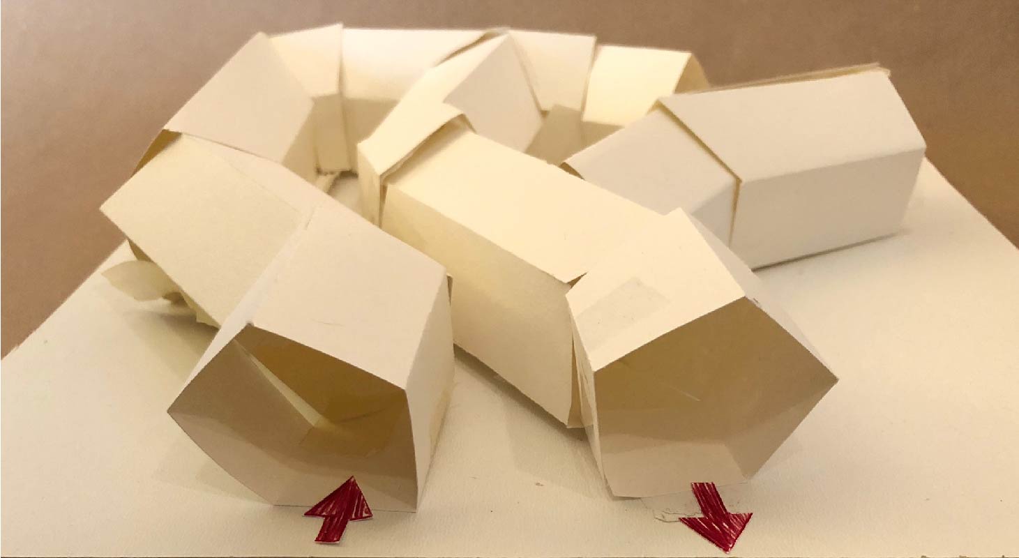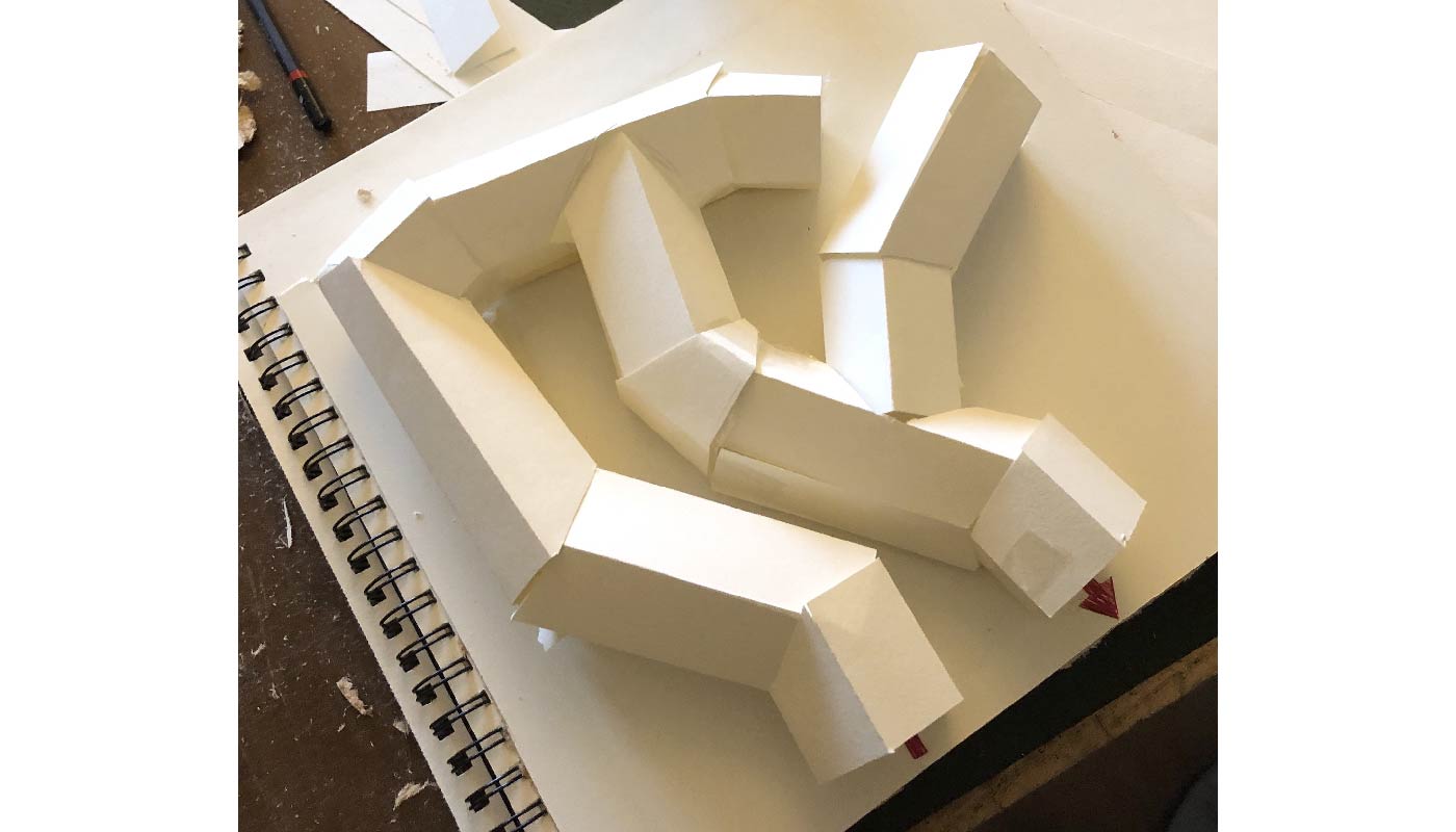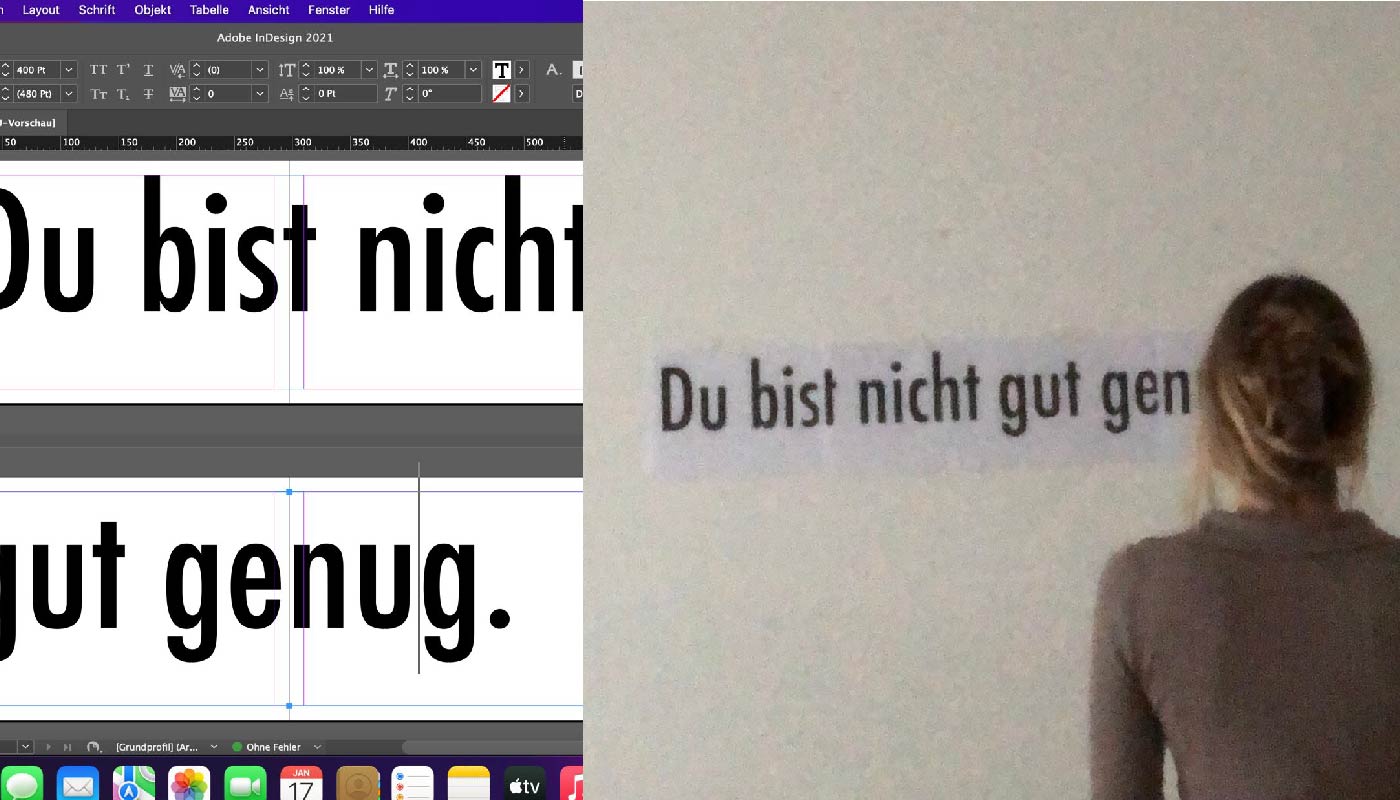 Für eine bessere Vorstellung des Aufbaus der Ausstellung, wurden zunächst verschiedene Varianten skizziert. Einmal eine Art Gerüst, bei welchem man auf- und absteigen kann. Die andere Variante war ein Tunnel. Der Tunnel machte dabei mehr Sinn, da man so passend zum Thema Overthinking, isoliert wird und ein beklemmenderes Gefühl bekommt. Zudem ist es bei dem Tunnel besser umzusetzen, die „lautleise“, Audioelemente zu vermitteln, wenn man sich in einem geschlossenem Gang befindet. Das Papiermodell wurde dann erstellt, um einen besseren Überblick des Aufbaus zu bekommen. Es zeigt die Anlehnung an ein Labyrinth, denn auch bei der Ausstellung soll es unübersichtlich wirken, zudem Verzweigungen und Sackgassen geben. Einen Abschnitt des Tunnels wurde dann in einem weiteren rapid Papierprototyp dargestellt, bei welchem die Sätze und Illustrationen an den Wänden des Pentagon eingezeichnet sind. Um ein Gefühl für die Größenverhältnisse der Schrift im Tunnel zu bekommen, wurde das Ganze getestet, indem ein Satz gedruckt und an der Wand befestigt wurde.