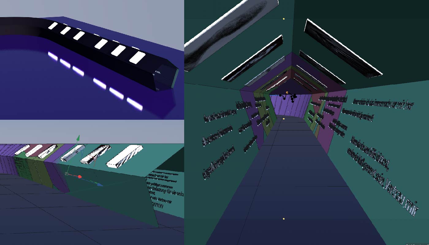 Zusätzlich zum Papierprototypen wurde ein virtuelles Modell der Ausstellung gestaltet. Dieses besteht aus einer beispielhaften Audiospur, die man als Besucher per Kopfhörer hört, und aus einem 3D-modellierten Video, das den Betrachter durch einen Abschnitt des labyrinth-artigen Tunnels führt.