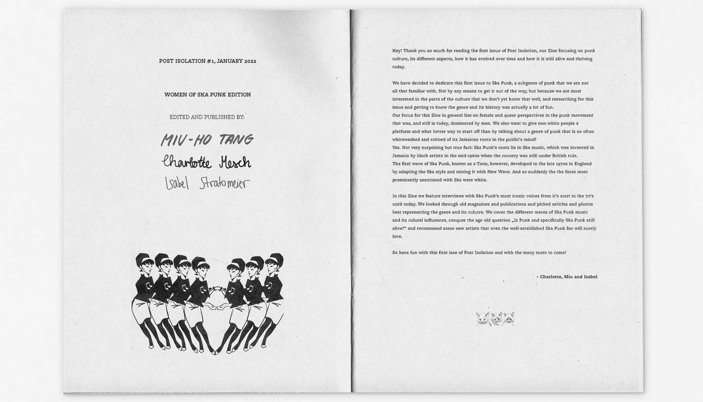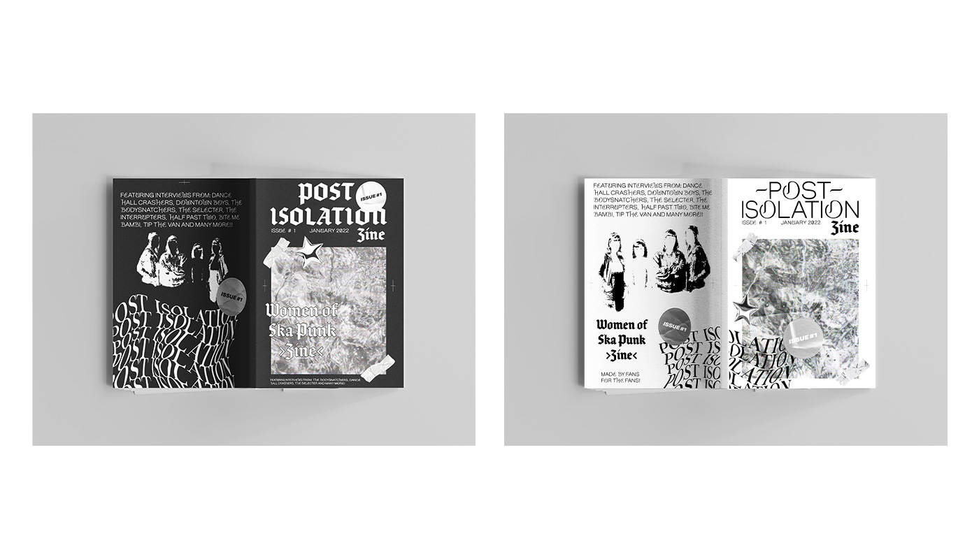 Wir haben ein Fanzine erstellt, da es viele verschiedene Aspekte von Gestaltung abdeckt und uns somit viel Freiheit bei der Entwicklung erlaubt. Das Thema des Fanzines ist Ska Punk, passend zu unserem Semester-Thema, mit dem Titel ‘Post Isolation’. Der Fokus des Zines sind Frauen in der Ska Punk Szene und wie sie die Subkultur beeinflusst und geprägt haben. Das Zine wird von Fans gestaltet für andere Fans von Ska Punk, damit ein stärkerer Zusammenhalt in der Gemeinschaft erzielt werden kann, da die Pandemie uns sehr voneinander distanziert hat. Das Ziel unseres Projektes ist Leuten die Geschichte von Ska Punk näherzubringen und Fans insgesamt zusammenzubringen und die Freuden und positiven Empfindungen von Ska Punk zu übermitteln. Zum Fanzine haben wir einen passenden Ausstellungsstand gestaltet, auf der unser Fanzine in der Ausstellung Platz finden würde.