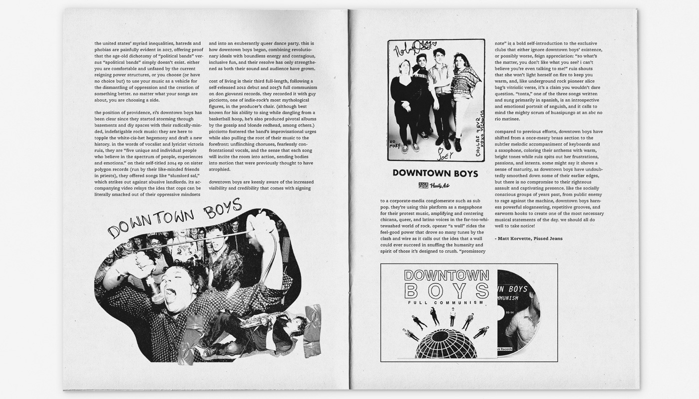 Besonders Bands, die nicht im Mainstream stattfinden, werden in eigens publizierten Zines besprochen. Die Downtown Boys beispielsweise würden wegen ihrer lauten politischen Verbalität eher nicht von großen Magazinen besprochen werden. Im Post Isolation Zine finden sie aber Platz.