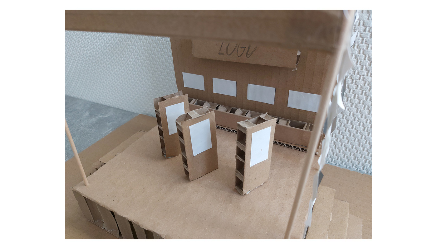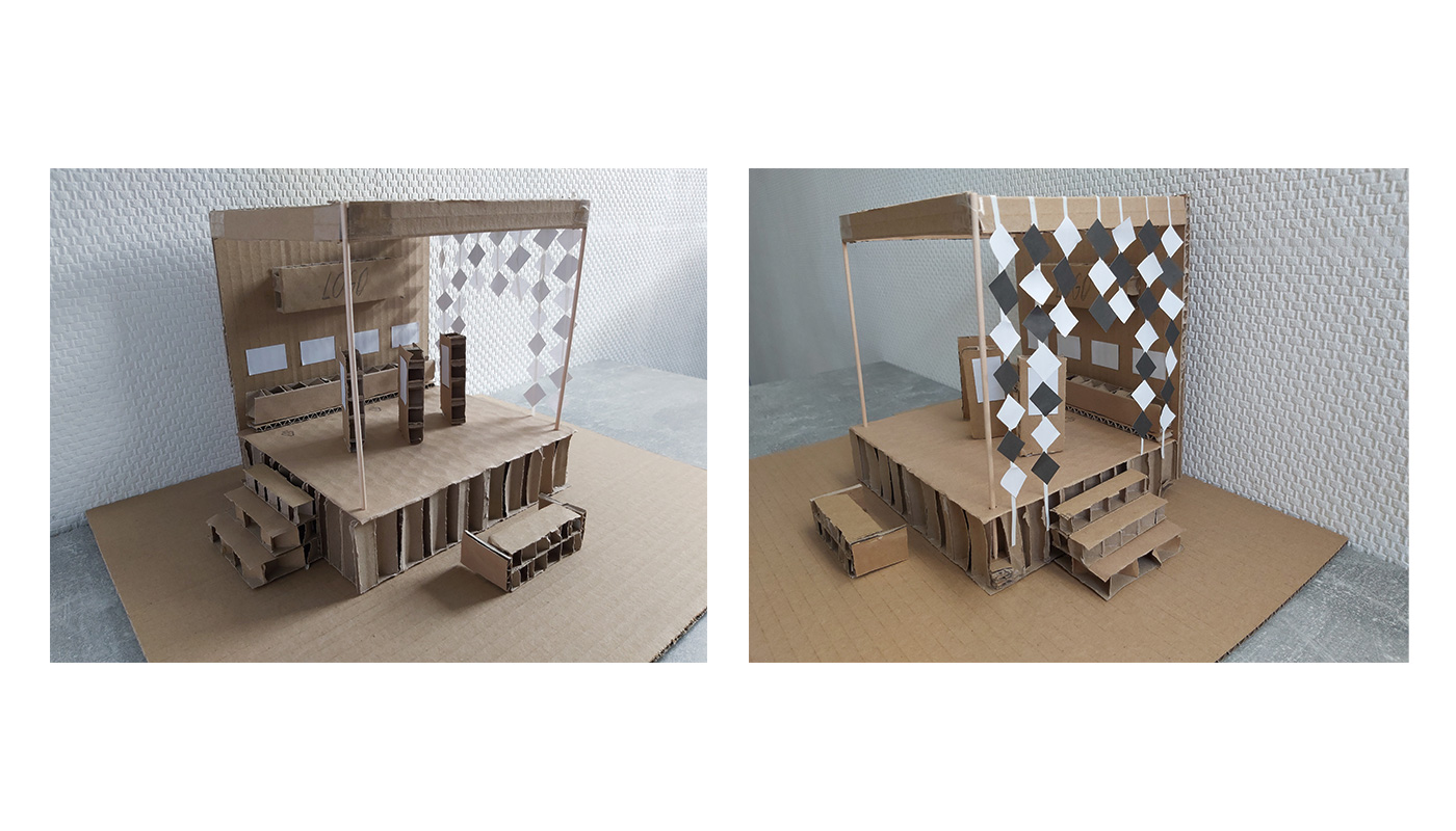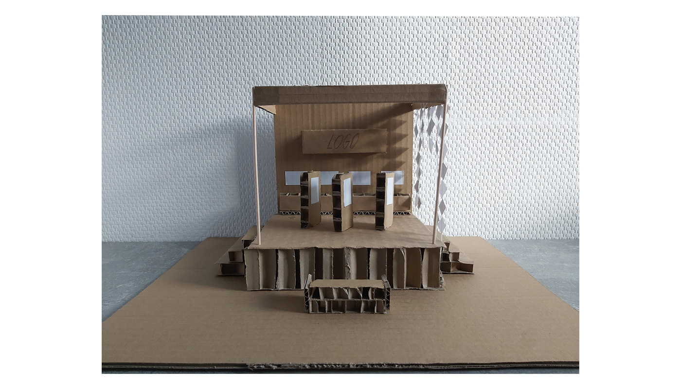 Für den Ausstellungsstand des Fanzines wurde ein Papp-Prototyp angefertigt: Wir haben uns für eine Bühne entschieden, auf der Besucher multimedial sowohl Hintergrundinformationen als auch erste Einblicke und Eindrücke vom Fanzine sammeln können. An den Seiten der Bühne hängen von der Decke abwechselnd schwarze und weiße Fanzine-Covers: Visuell bilden die Fanzine-Cover ein Schachbrettmuster, das ein typisches gestalterisches Element von Ska-Punk ist. Vor der Bühne befindet sich die Verkaufstheke, an der die Fanzines erworben werden können: Bei höherem Besucheraufkommen bildet sich dabei vor der Bühne eine „Zuschauermasse“.