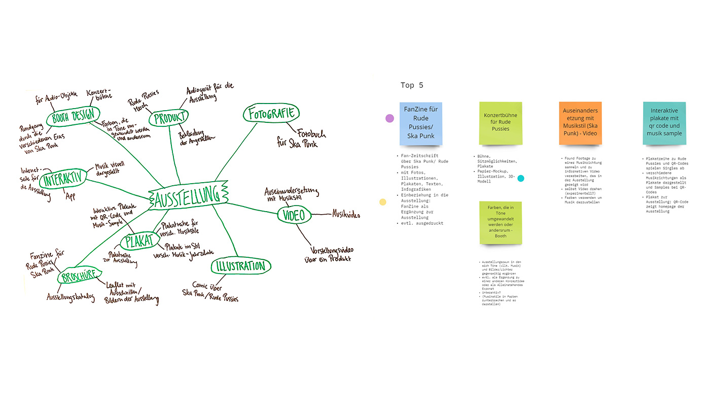 Erste Ideen, Ansätze, Assoziationen und Themen wurden zusammen gebrainstormt und auf eine Mindmap übertragen. Daraus haben wir die fünf interessantesten Ideen ausgewählt und in einer finalen Wahl uns für die Idee eines Fanzines entschieden.