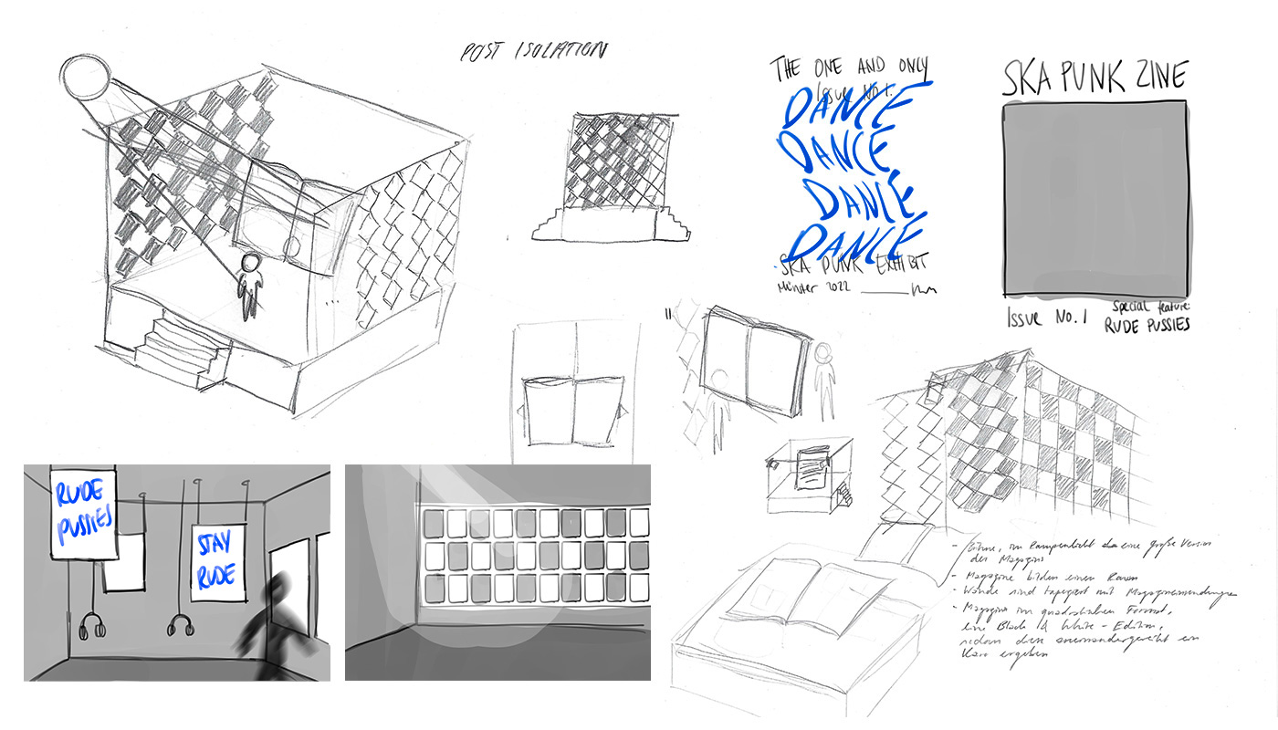 Es wurden sowohl analoge als auch digitale Skizzen und Scribbles angefertigt. Dabei wurden sowohl mögliche Fanzine-Cover-Layouts als auch Ausstellungsstände dargestellt, in dem das Fanzine seinen Platz in der Ausstellung finden würde.