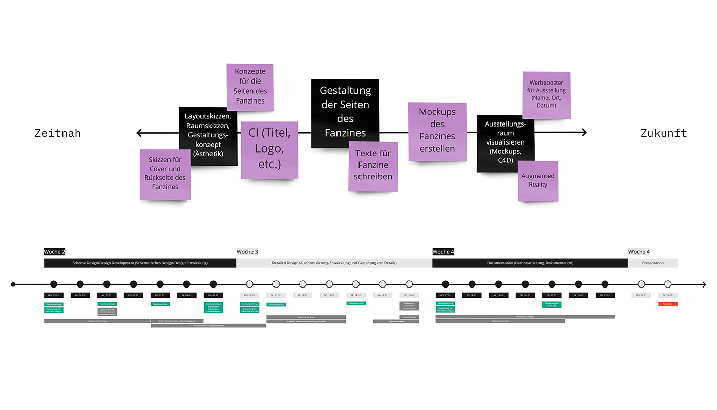 Wir haben unseren Designprozess in zwei Zeitleisten visualisiert: Auf der ersten Leiste werden anstehende Aufgaben hinsichtlich ihrer Priorität aufgestellt und zeitlich grob geordnet. Die zweite Zeitleiste gibt einen Überblick darüber, zu welchem genauen Zeitpunkt bestimmte Zwischenergebnisse bearbeitet werden sollen und welche Termine anstehen. Es gab sowohl Phasen der gemeinsamen Gruppenarbeit als auch einzelne Aufgaben, die wir in der Gruppe aufgeteilt haben. Sämtliche Zwischenergebnisse wurden mehrmals in der Woche miteinander kommuniziert, damit die einzelnen Teilbereiche Fanzine-Cover, Fanzine-Seiten und Ausstellungsstand dementsprechend aufeinander angepasst werden können.