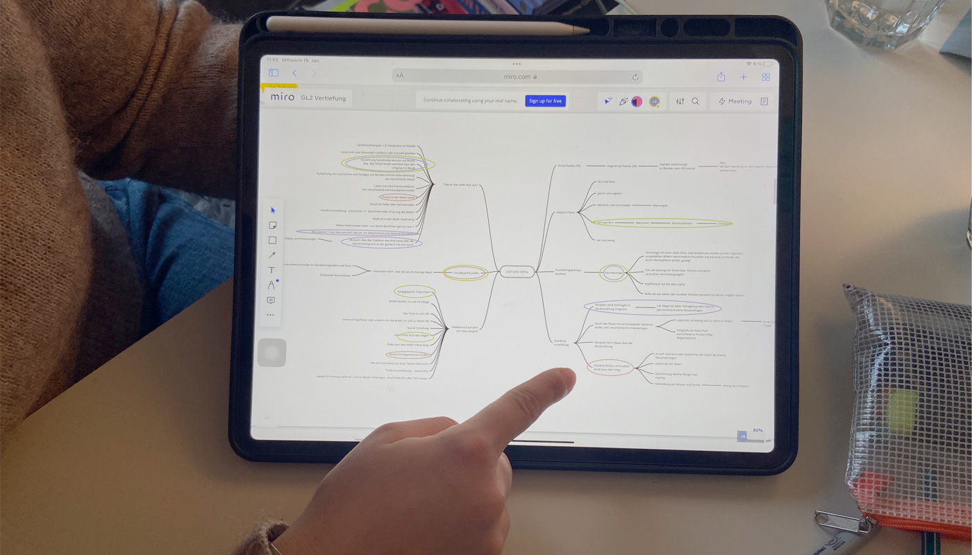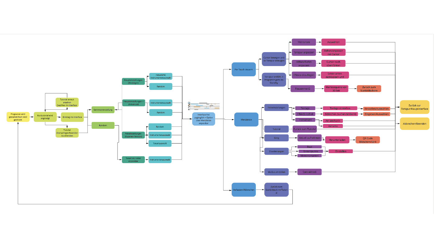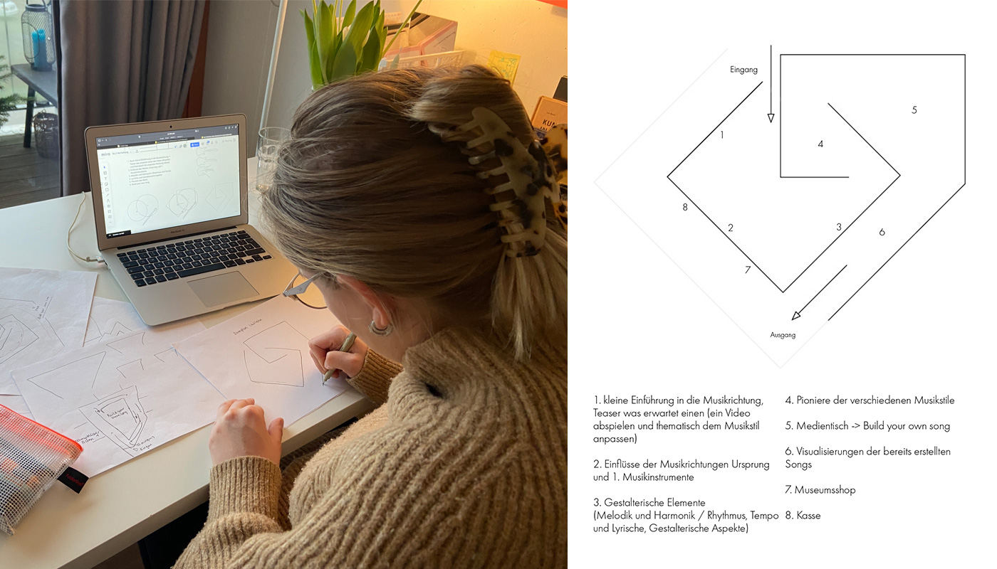 Nach dem ersten Brainstorming, bei dem wir die bisher erlernten Inhalte besprochen haben, waren wir uns einig, dass wir etwas interaktives zum Thema Musik gestalten möchten. Dabei war es uns von Anfang an besonders wichtig, unsere persönlichen Schwerpunkte in dem Projekt zu vereinen. Wir haben mit einer Mindmap in miro gestartet und verschiedene Assoziationen und Gedankengänge zu dem Thema „lautleise“ gesammelt. Die Hauptfrage war, welchen Inhalt wir mit unseren Skills am besten ausstellen können und wie es in ein passendes Medium integriert werden kann. Der Ausstellungsbesucher soll etwas in unserer Ausstellung lernen und das Wissen direkt umsetzen können. Die Mindmap haben wir genutzt, um erste Ideen festzuhalten. Im nächsten Schritt haben wir als Gruppe fünf Ideen ausformuliert, um uns den Entscheidungsprozess zu erleichtern. Schlussendlich haben wir uns für den interaktiven Medientisch mit dem Inhalt „Build your own song“ entschieden.