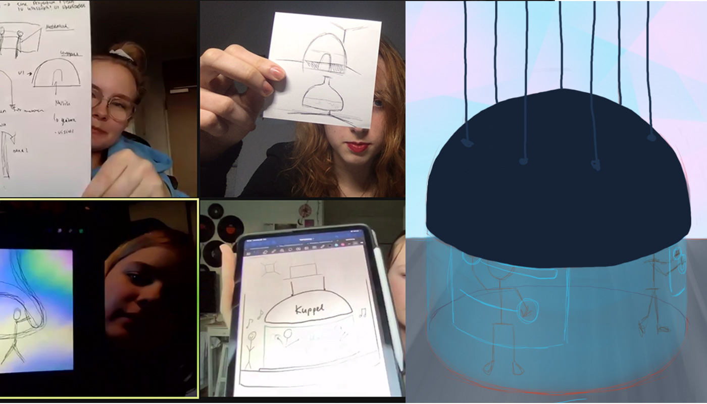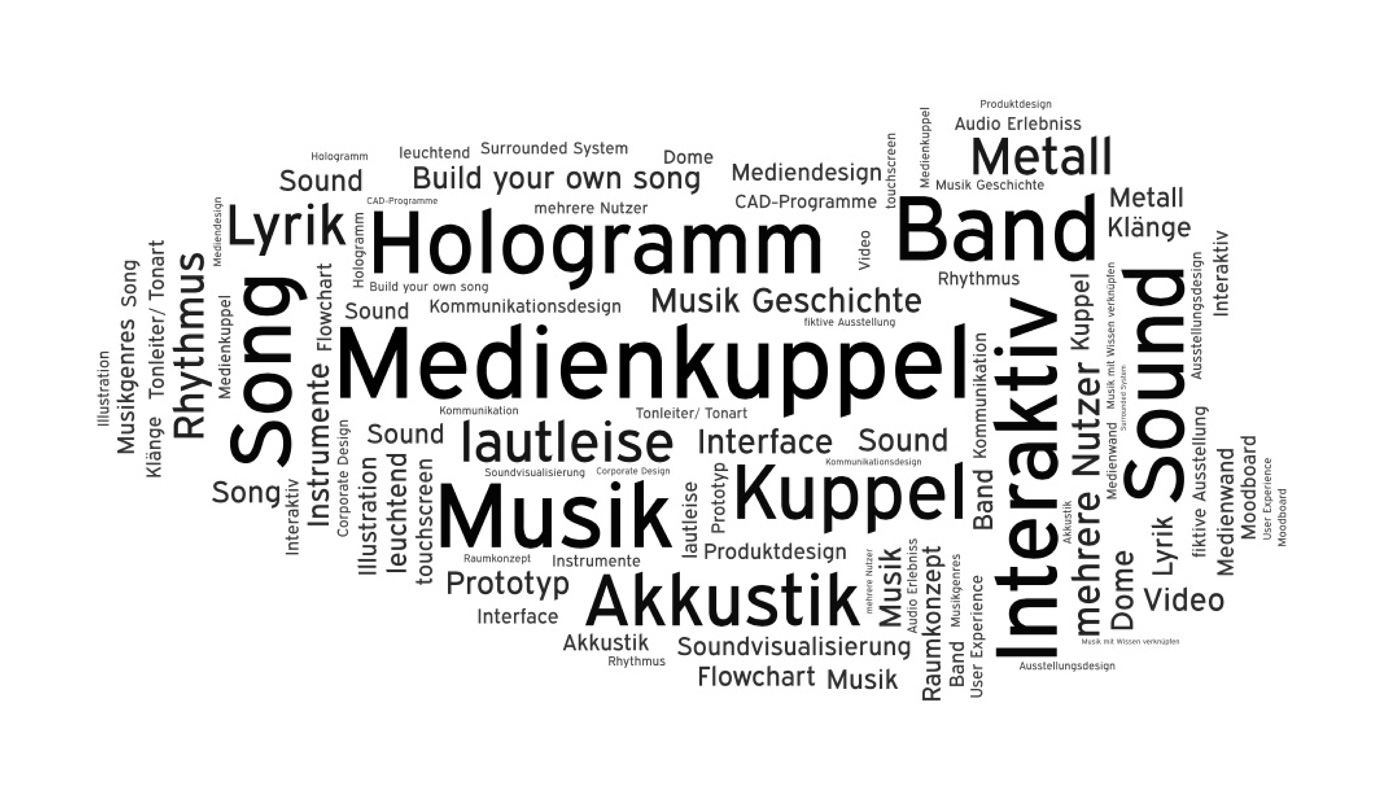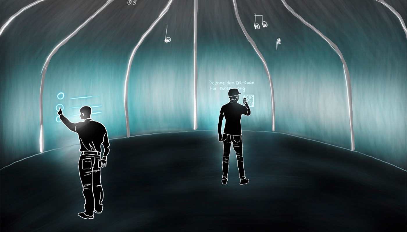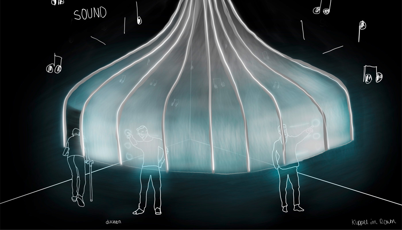 Während der Konzeptentwicklungsphase sind wir von einem Medientisch im klassischen Sinne ausgegangen – der Ausstellungsbetrachter sollte diesen allein benutzen. Im Laufe des Prozesses haben wir uns von dieser Form gelöst und eine für uns passendere Form entwickelt, um den gleichzeitigen Zugang für jeden Besucher zu ermöglichen. Die Referenzen aus der Gruppenarbeit haben wir in einem Moodboard und einer Morphologischen Matrix, für die Materialien der Kuppel, vereint. Beim Betreten des letzten Raumes wird der Rezipient mithilfe der Form des Domes direkt dazu animiert, unter die Kuppel zu kommen und das Lied mitzugestalten. Durch das transparente Material der Kuppel kann jeder direkt sehen, was genau dort passiert. Außerdem transportiert die offene Form der Kuppel gut den Sound in den Raum. Aus der entstandenen Vorarbeit haben wir erste Visualisierungen gezeichnet, die uns bei der Umsetzung für die späteren Prototypen sehr geholfen haben.