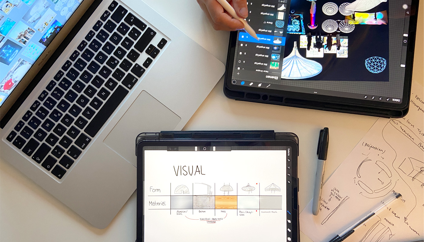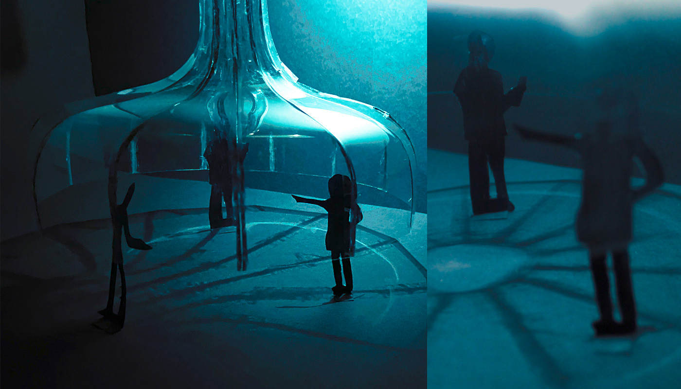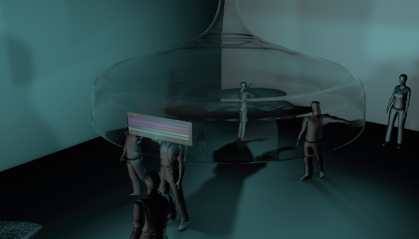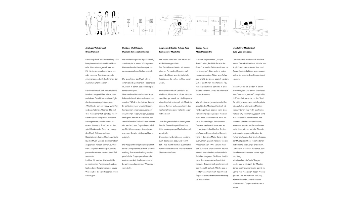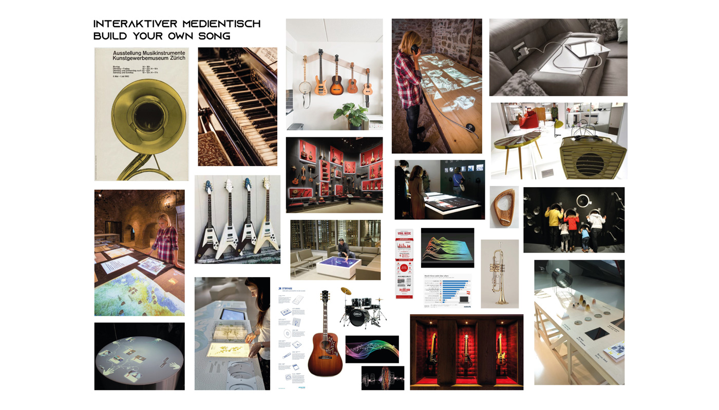 Während der Konzeptentwicklungsphase sind wir von einem Medientisch im klassischen Sinne ausgegangen – der Ausstellungsbetrachter sollte diesen allein benutzen. Im Laufe des Prozesses haben wir uns von dieser Form gelöst und eine für uns passendere Form entwickelt, um den gleichzeitigen Zugang für jeden Besucher zu ermöglichen. Die Referenzen aus der Gruppenarbeit haben wir in einem Moodboard und einer Morphologischen Matrix, für die Materialien der Kuppel, vereint. Beim Betreten des letzten Raumes wird der Rezipient mithilfe der Form des Domes direkt dazu animiert, unter die Kuppel zu kommen und das Lied mitzugestalten. Durch das transparente Material der Kuppel kann jeder direkt sehen, was genau dort passiert. Außerdem transportiert die offene Form der Kuppel gut den Sound in den Raum. Aus der entstandenen Vorarbeit haben wir erste Visualisierungen gezeichnet, die uns bei der Umsetzung für die späteren Prototypen sehr geholfen haben.