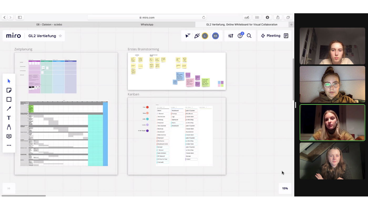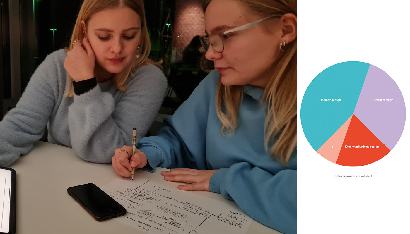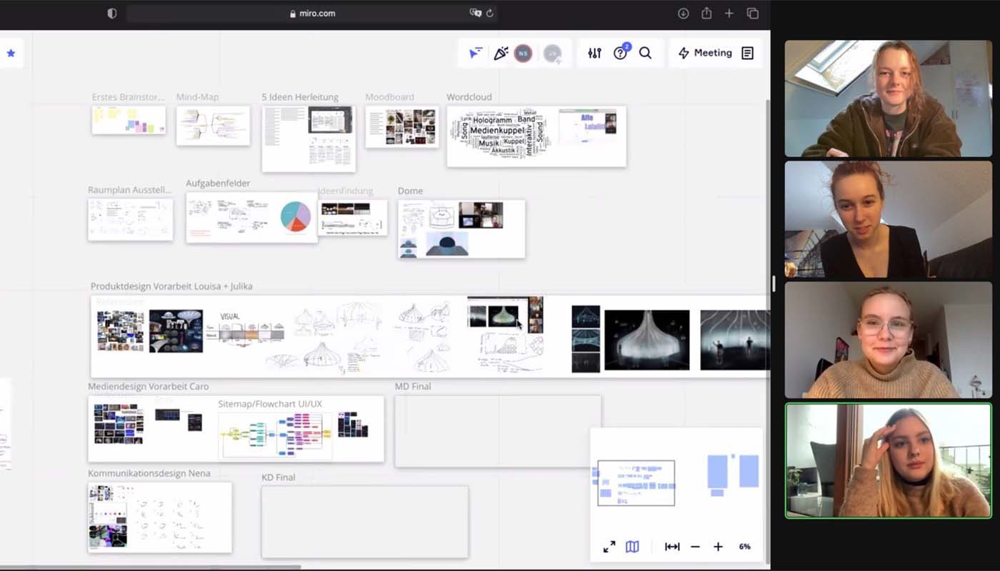 Bevor es an die finale Erstellung der Ausstellung ging, haben wir herausgefiltert was der Prototyp am Ende darstellen soll und welche Arbeitsschritte uns dort hinleiten. Anschließend haben wir die verschiedenen Aufgaben passend zu unseren zukünftigen Studienschwerpunkten aufgeteilt, so dass Louisa und Julika Produktdesign machen und sich um die Medienkuppel kümmern, Carolin setzt das User Interface (Mediendesign) um und Nena erstellt das Corporate Design und kleine Illustrationen in der Ausstellung. Für jeden Schwerpunkt haben wir gemeinsam Referenzen rausgesucht, um all unsere visuellen Ideen zu vereinen.