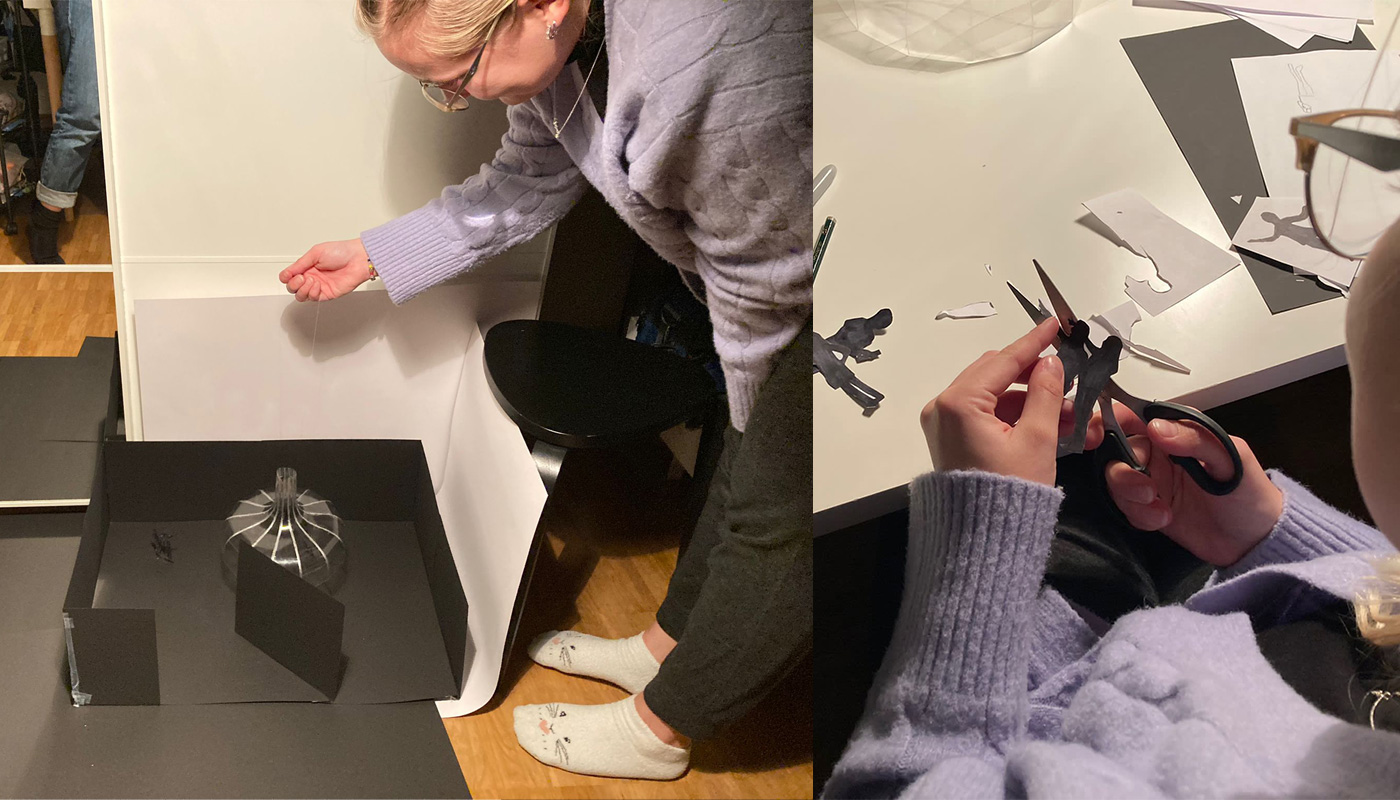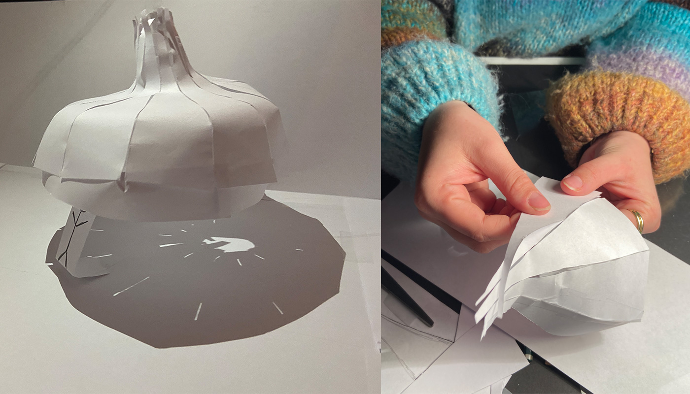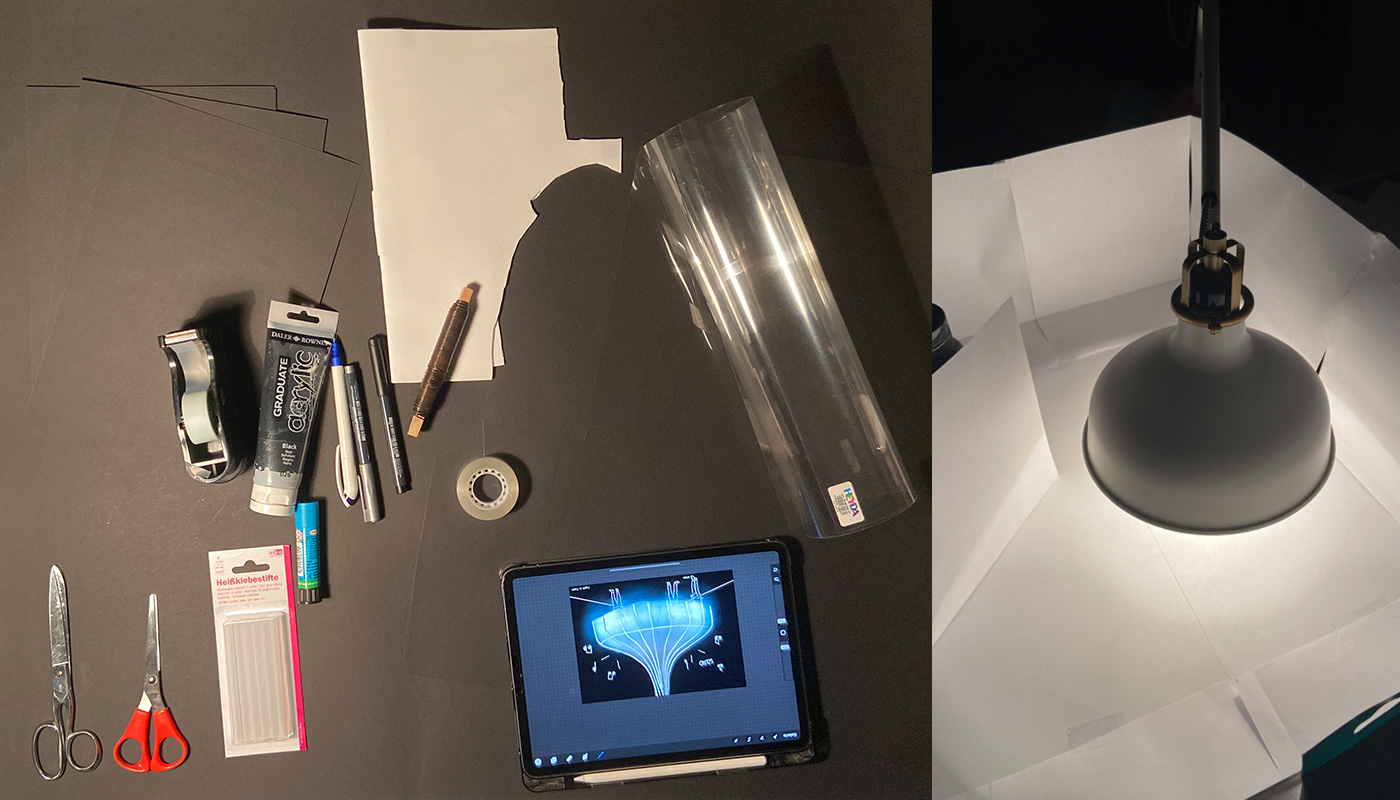 Materialien und erster rapid Prototyp, mit Papier und einem Lampenschirm als Kuppel