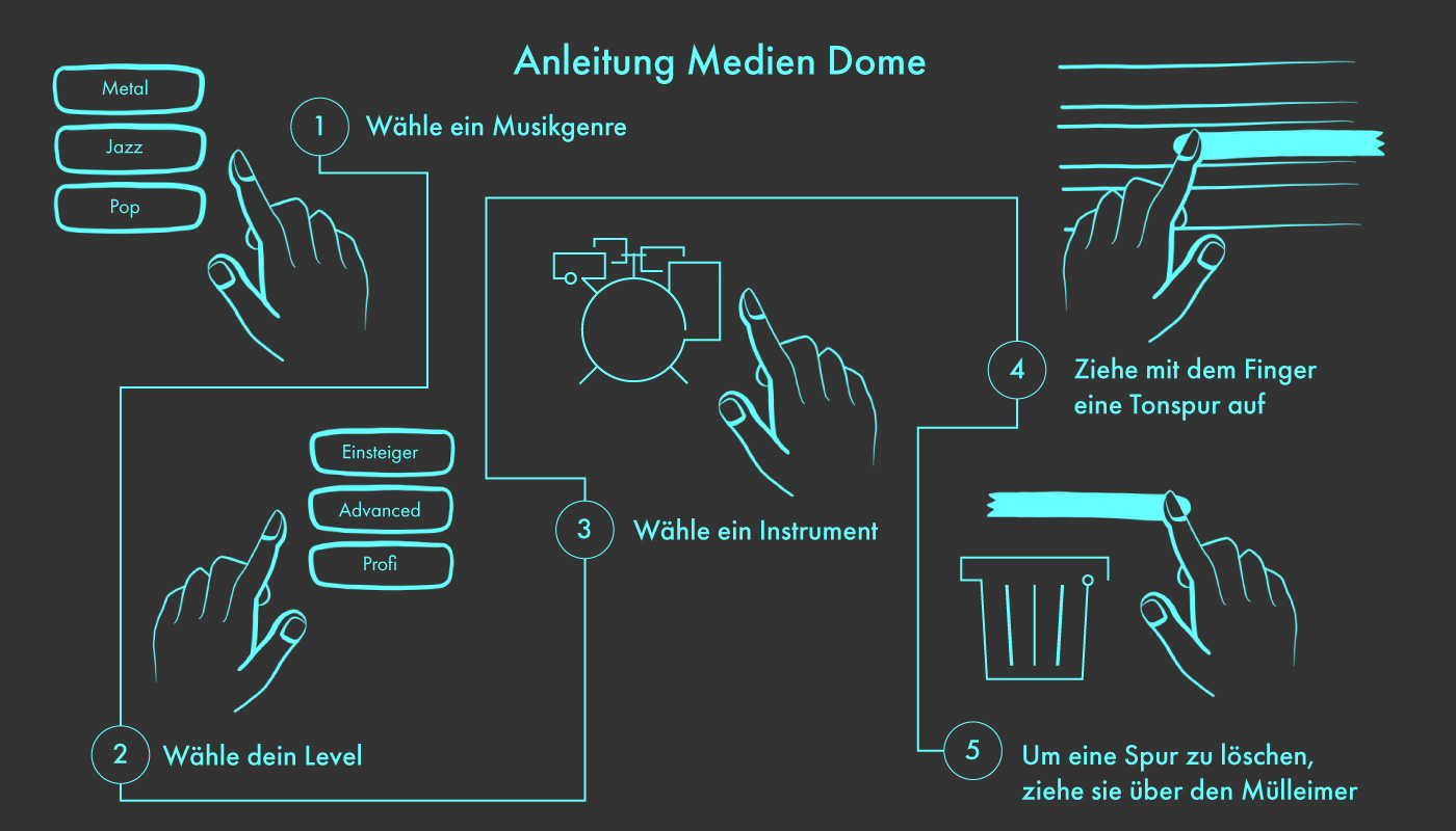 Das Ausstellungskonzept „Major Music“ lehrt etwas über verschiedene Musikgenres, deren verschiedene Instrumente, die Geschichte dahinter, wie sie verwendet werden und vieles mehr. Der Rezipient erlangt ein Verständnis für den Prozess des Song-Buildings und kann dieses letztendlich im letzten Raum der Ausstellung, wo sich die Medienkuppel befindet, anwenden. Die Medienkuppel wird von mehreren Besuchern durch einen großen Touchscreen mit diversen Einstellungsmodifikationen bedient. Durch ein interaktives Miteinander soll ein gemeinsamer Song entstehen. Der Sound wird durch ein Surround-System im oberen Teil des Domes integriert.
