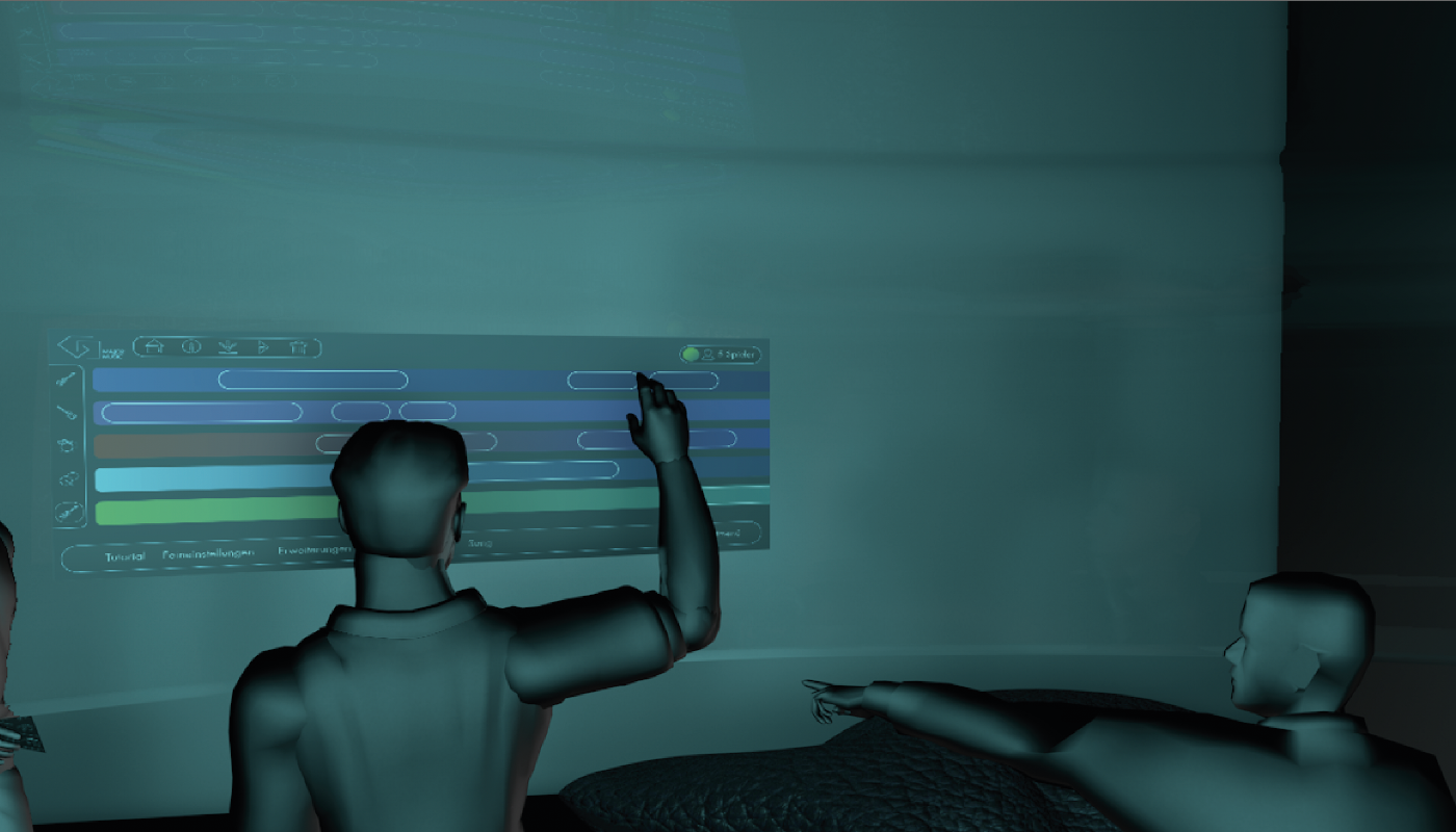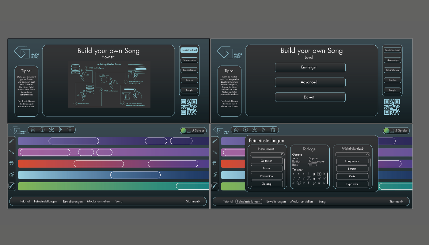 Das UI/Ux Design war ebenfalls auch ein wichtiger Standpunkt. Hier wurde sich am Styleboard orientiert, das Nena erstellt hatte. Hier war wichtig ein modernes aber schlichtes Design zu entwickeln, damit sich jeder ohne Probleme einfinden kann. Das Interface ist von Musikinterfaces inspiriert und wird mit den Händen bedient